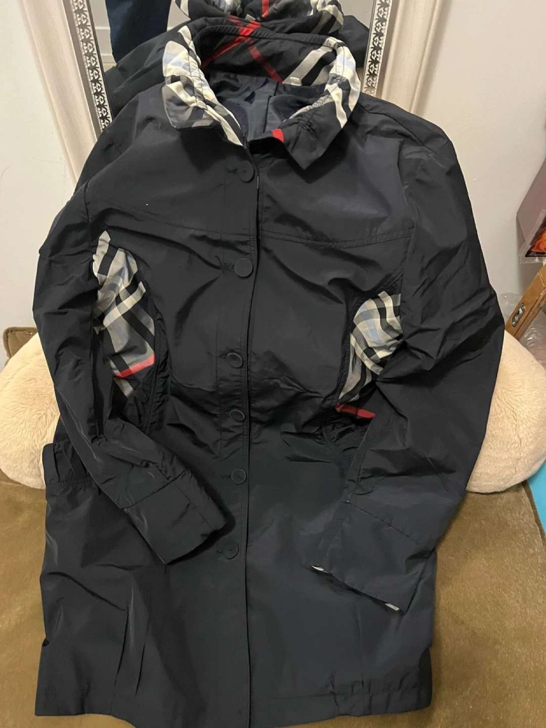 Stylish black trench coat (raincoat) with classic plaid details on collar and side panels.