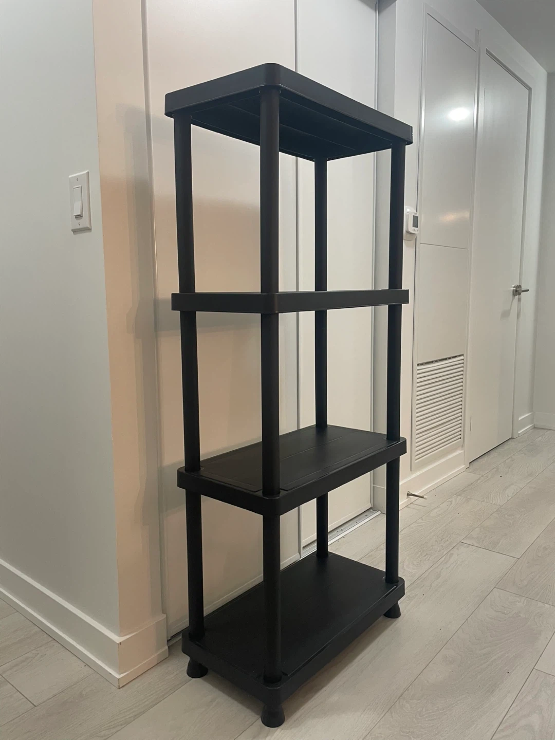 This is a handy black 4-tier plastic shelf, perfect for organizing your space! It's in great shape and ready to help you tidy up any room in your home. 2 units available.