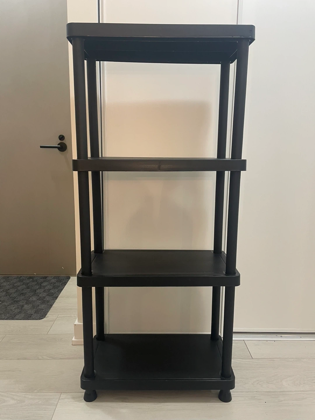 This is a handy black 4-tier plastic shelf, perfect for organizing your space! It's in great shape and ready to help you tidy up any room in your home. 2 units available.