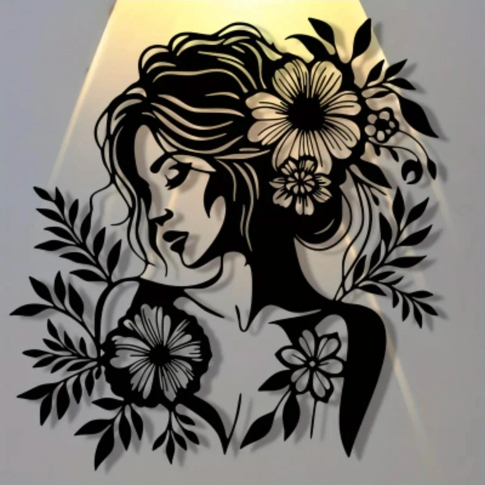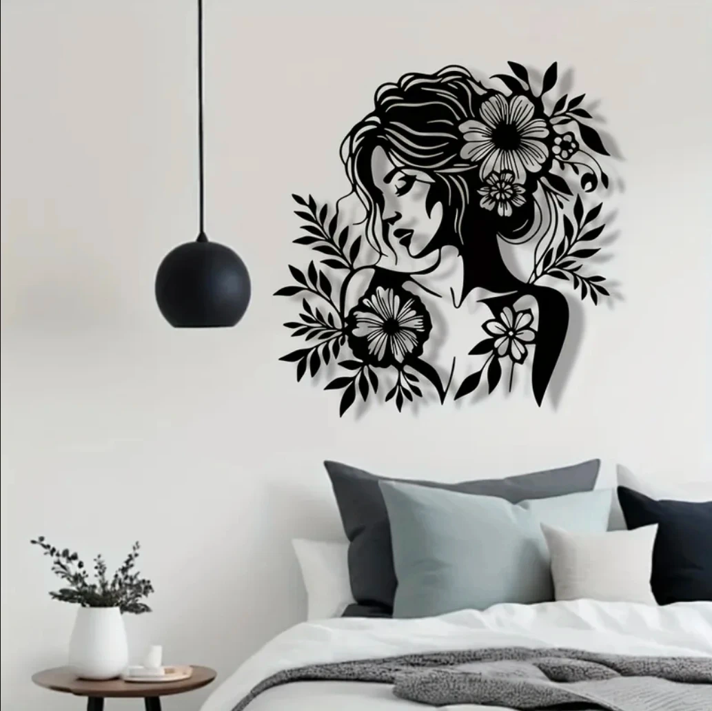 Elevate your space with this elegant and modern black metal wall art. Featuring a beautiful minimalist silhouette of a woman adorned with intricate floral details, this piece adds a sophisticated, artistic touch to any room. Its lightweight yet durable metal construction creates a subtle 3D shadow effect when hung, making it a perfect statement piece for a bedroom, living room, or home office.