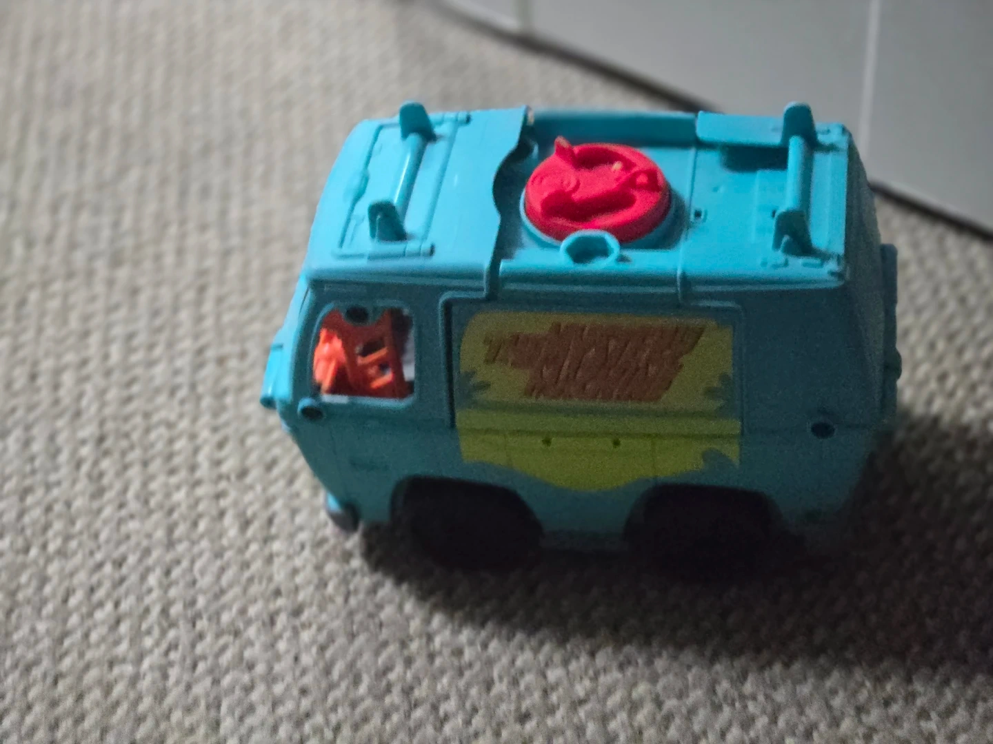 This is a toy version of the Mystery Machine from Scooby-Doo. It's teal with yellow and orange accents. The Scooby-Doo logo is visible on the side.