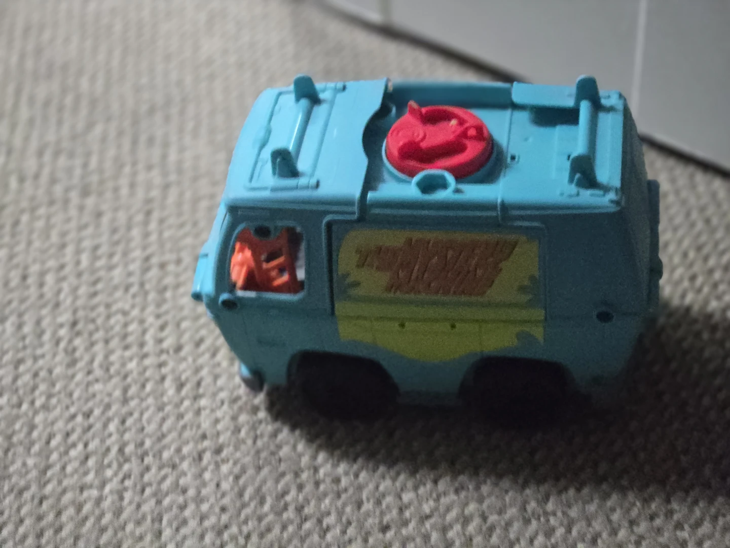 This is a toy version of the Mystery Machine from Scooby-Doo. It's teal with yellow and orange accents. The Scooby-Doo logo is visible on the side.