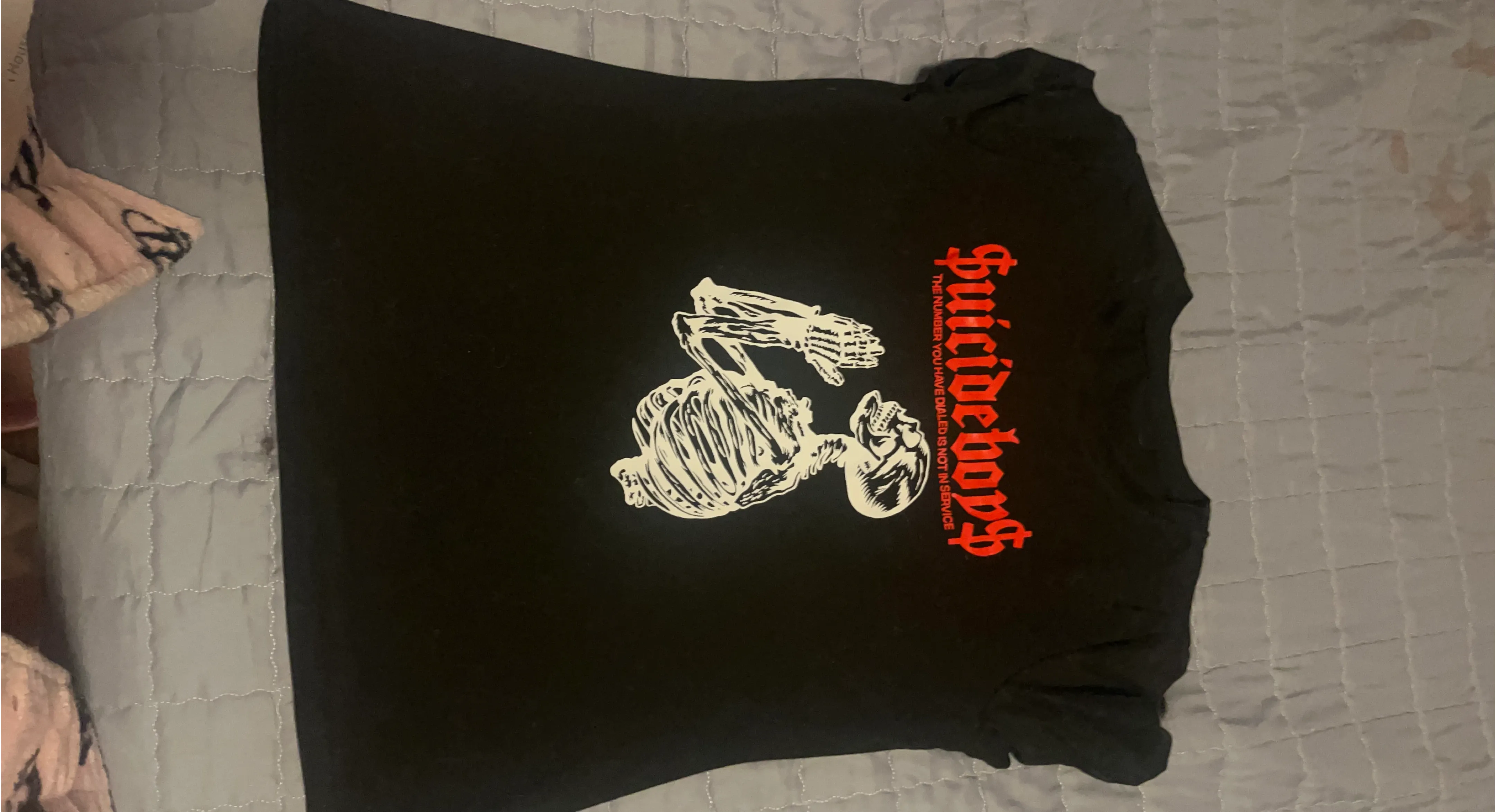 Black t-shirt with a graphic featuring a skeleton and the text "Suicideboys". It's a black crew neck tee. The graphic is a large skeleton illustration with red text.