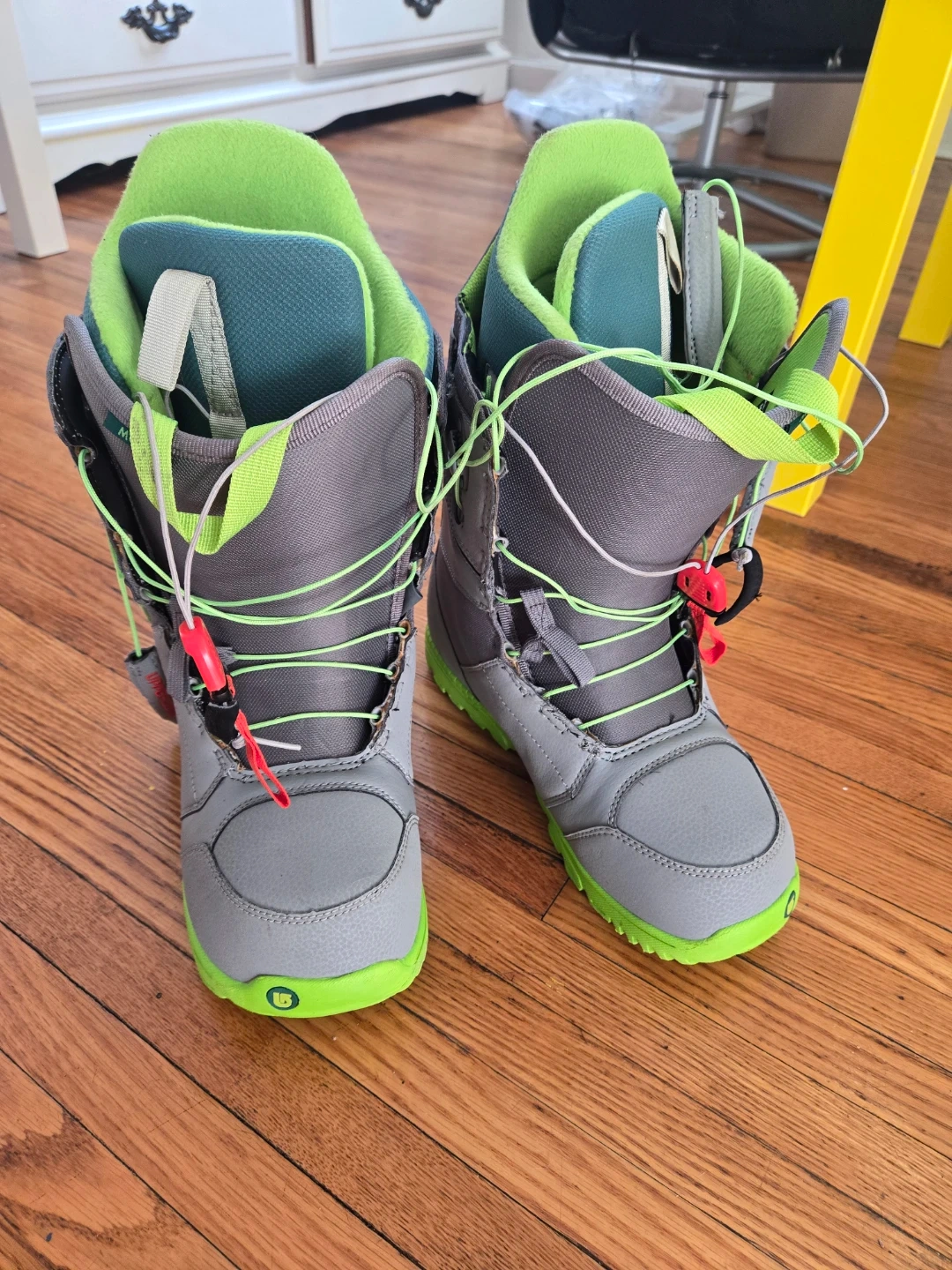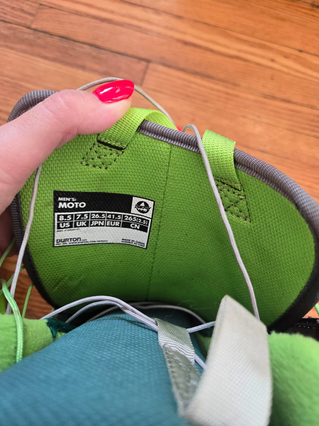 Burton Moto snowboard boots. Marked men's size 8.5 (will also fit womens 8-9 perfectly). Gray boots with neon green accents and feature a lacing system. They're designed for snowboarding comfort and performance.