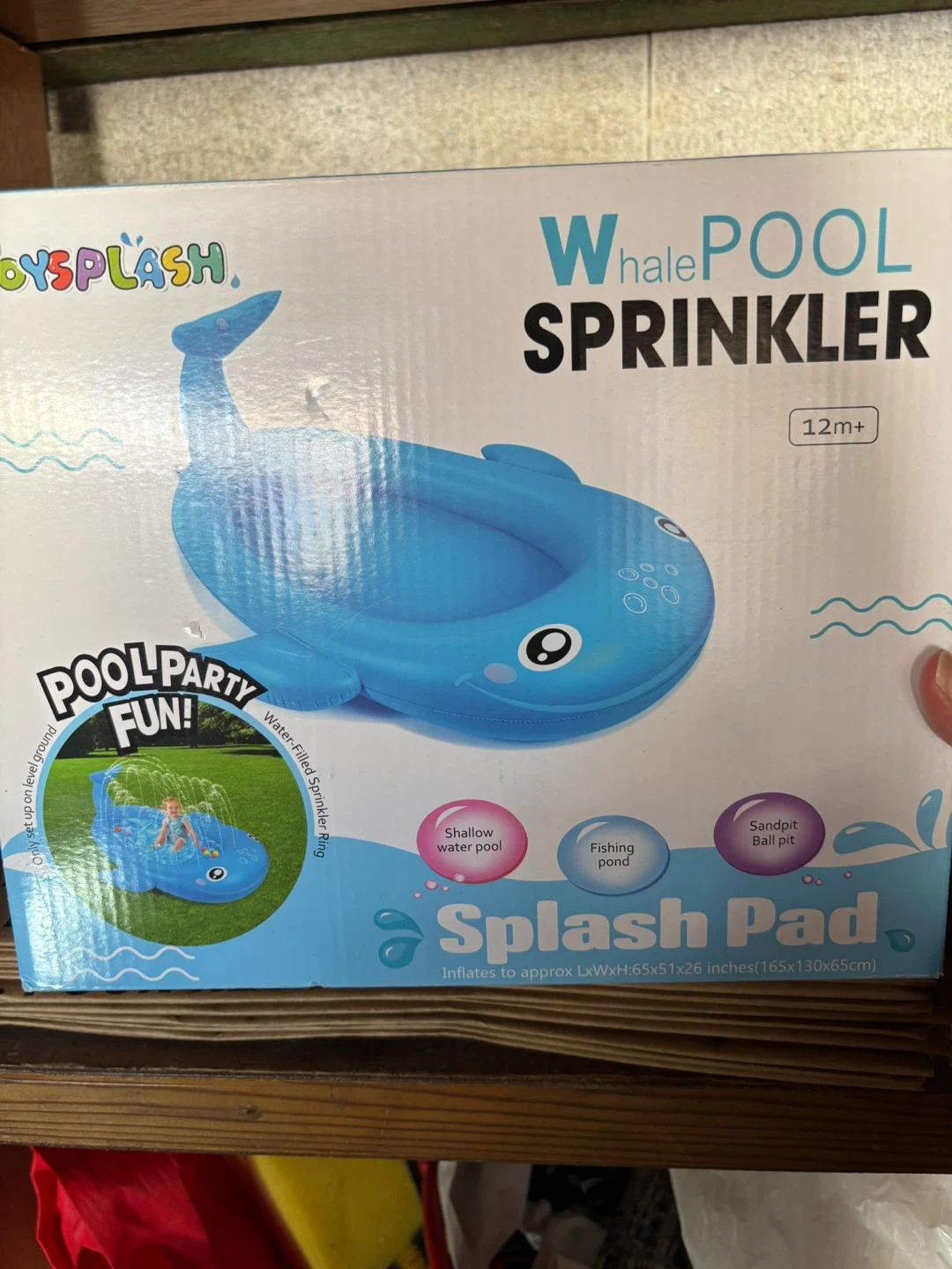 This whale-shaped sprinkler splash pad adds water-filled fun for kids. It can be used as a shallow water pool, fishing pond, or sandpit. Inflates to approximately 65x51x26 inches.