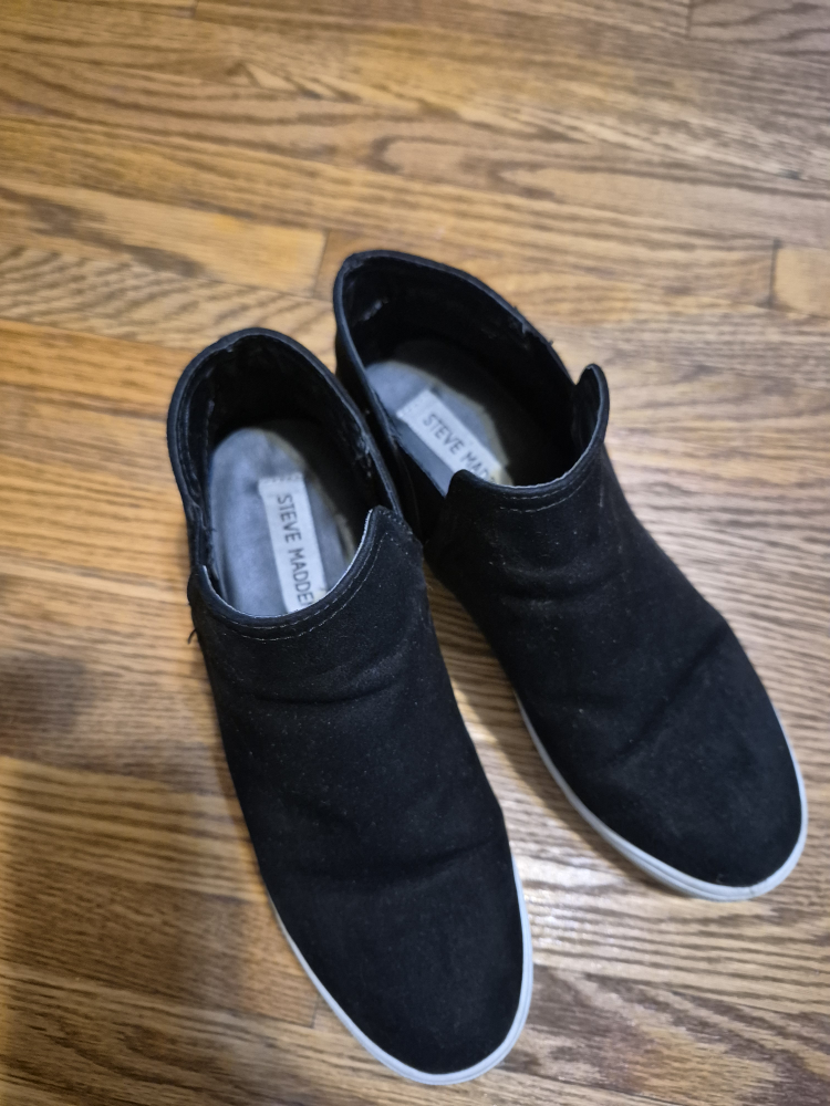 Selling a pair of Steve Madden black suede wedge sneakers in size 8. They are in good condition and ready for a new home!