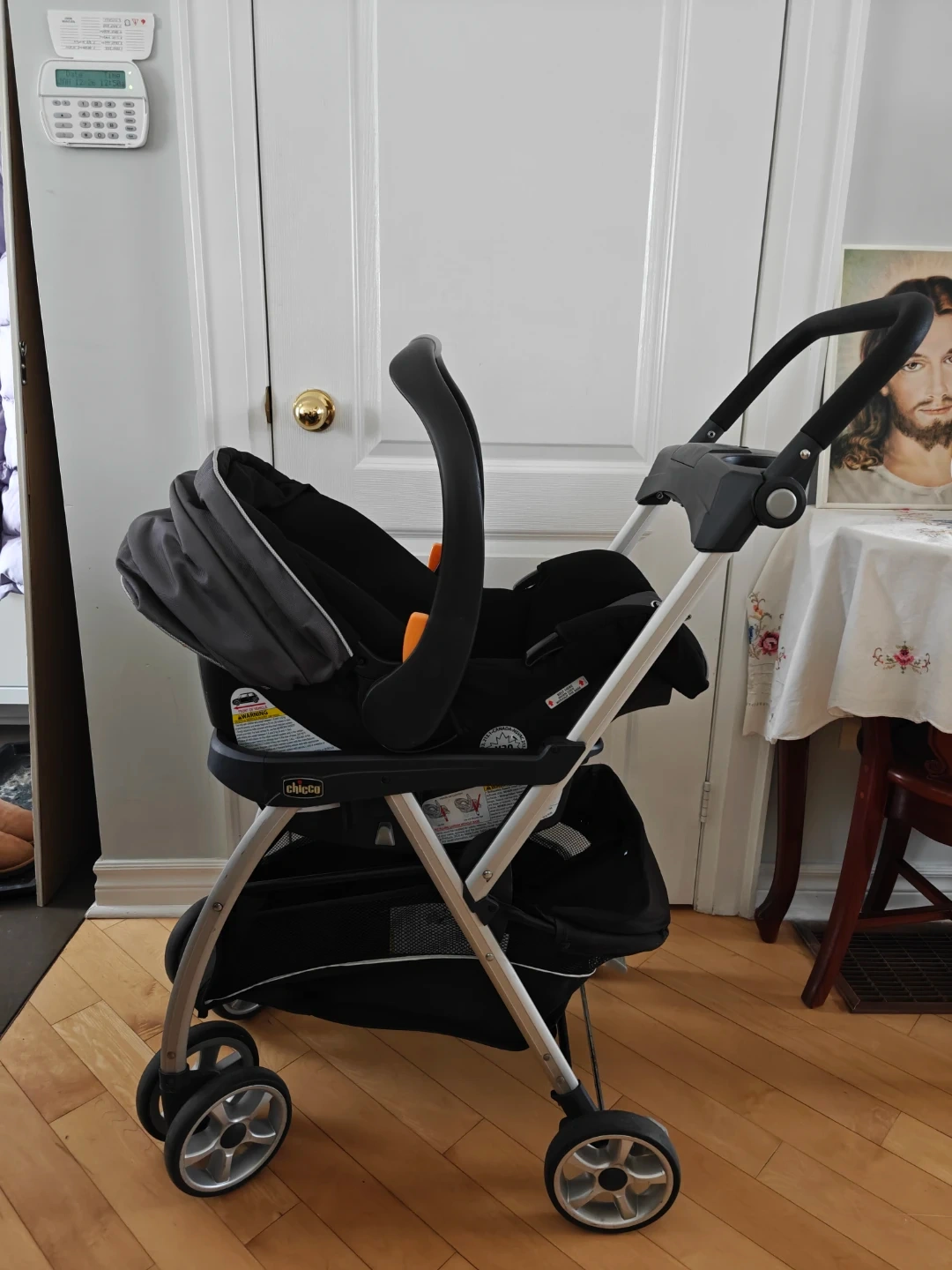 Selling a Chicco KeyFit 30 infant car seat and stroller combo. The car seat is black and grey. The manufacture date is 2022 April 22. Model number is 7923751A. It's in great condition and ready for a new family!
