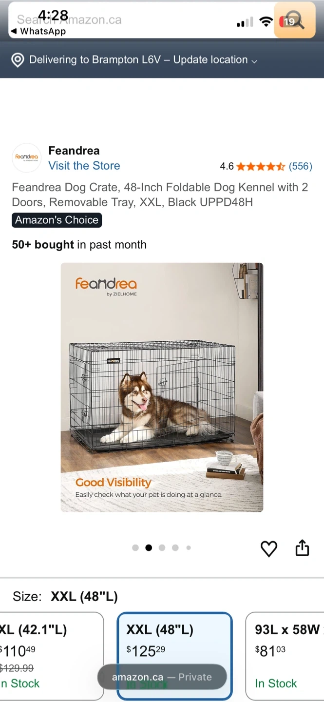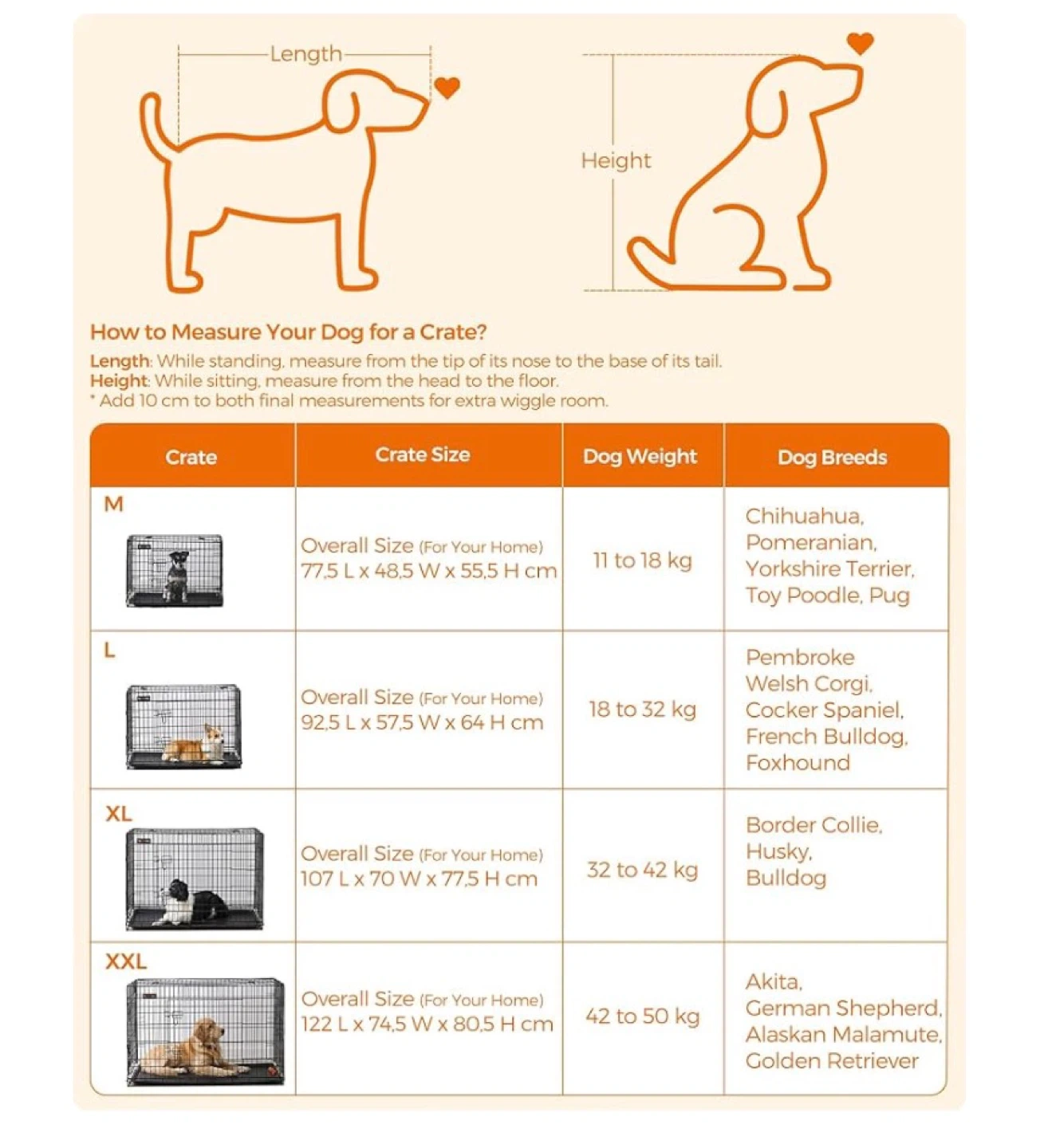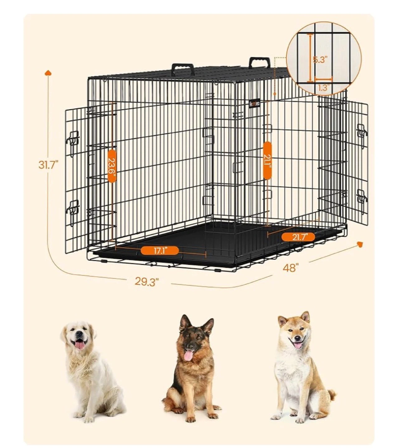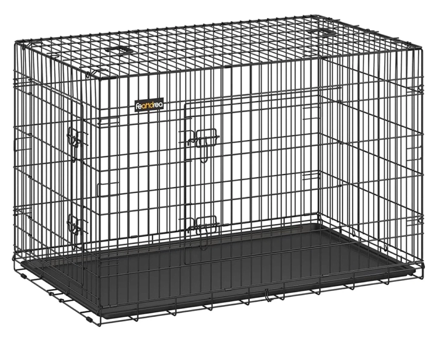 This is a Feandrea XXL dog crate, measuring 48 inches in length. It's foldable and has two doors with a removable tray. The wire construction provides good visibility of your pet. Suitable for dogs weighing 42 to 50 kg.