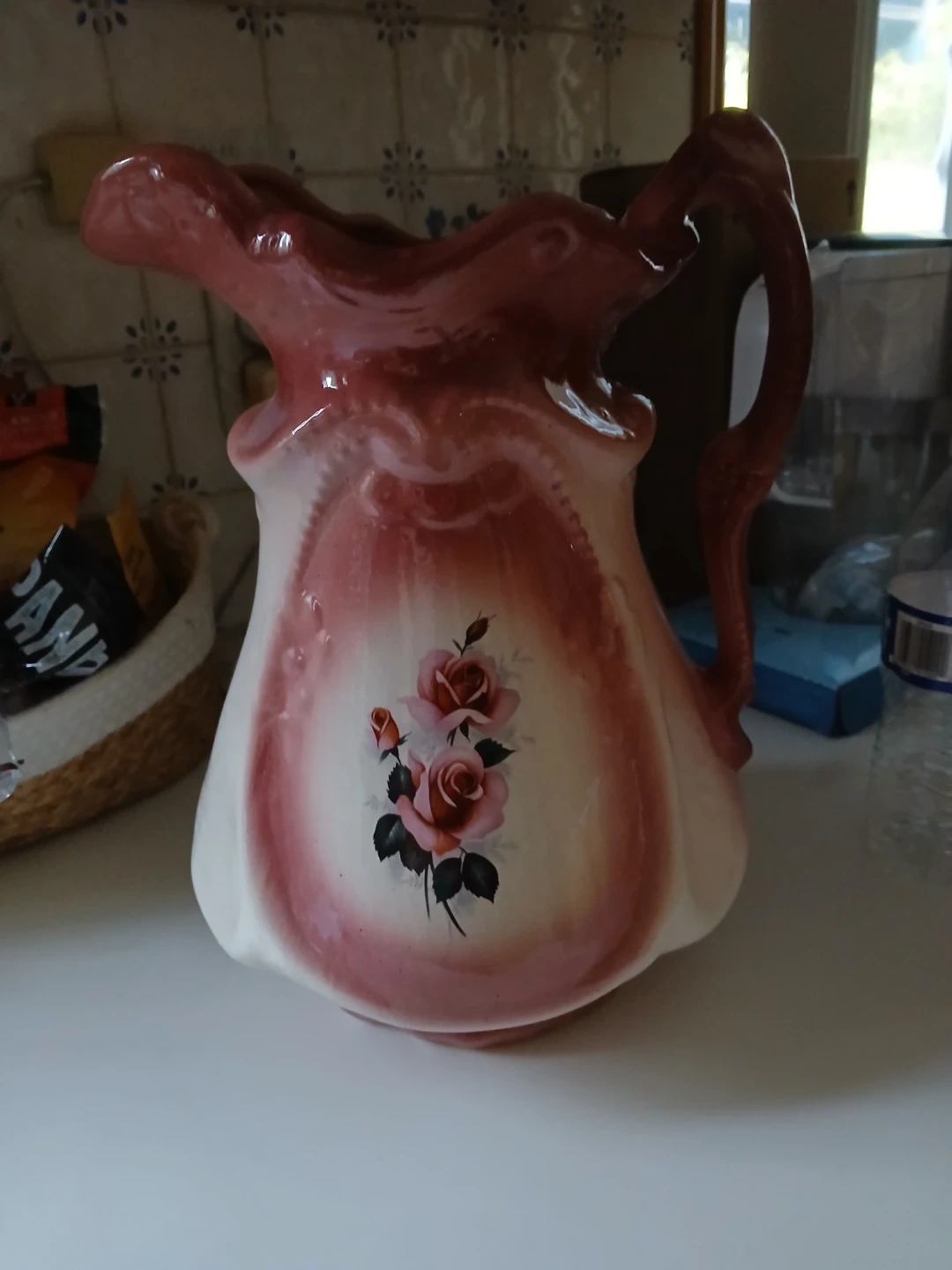 Vintage Ironstone pitcher featuring a lovely pink and white design with floral accents. It would look great in any home!