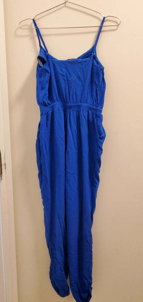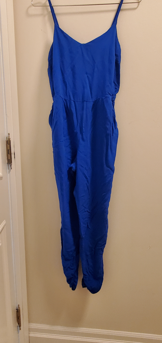 Size small blue jumpsuit from F&F. The jumpsuit has thin adjustable straps and a v-neck, and most importantly, pockets!