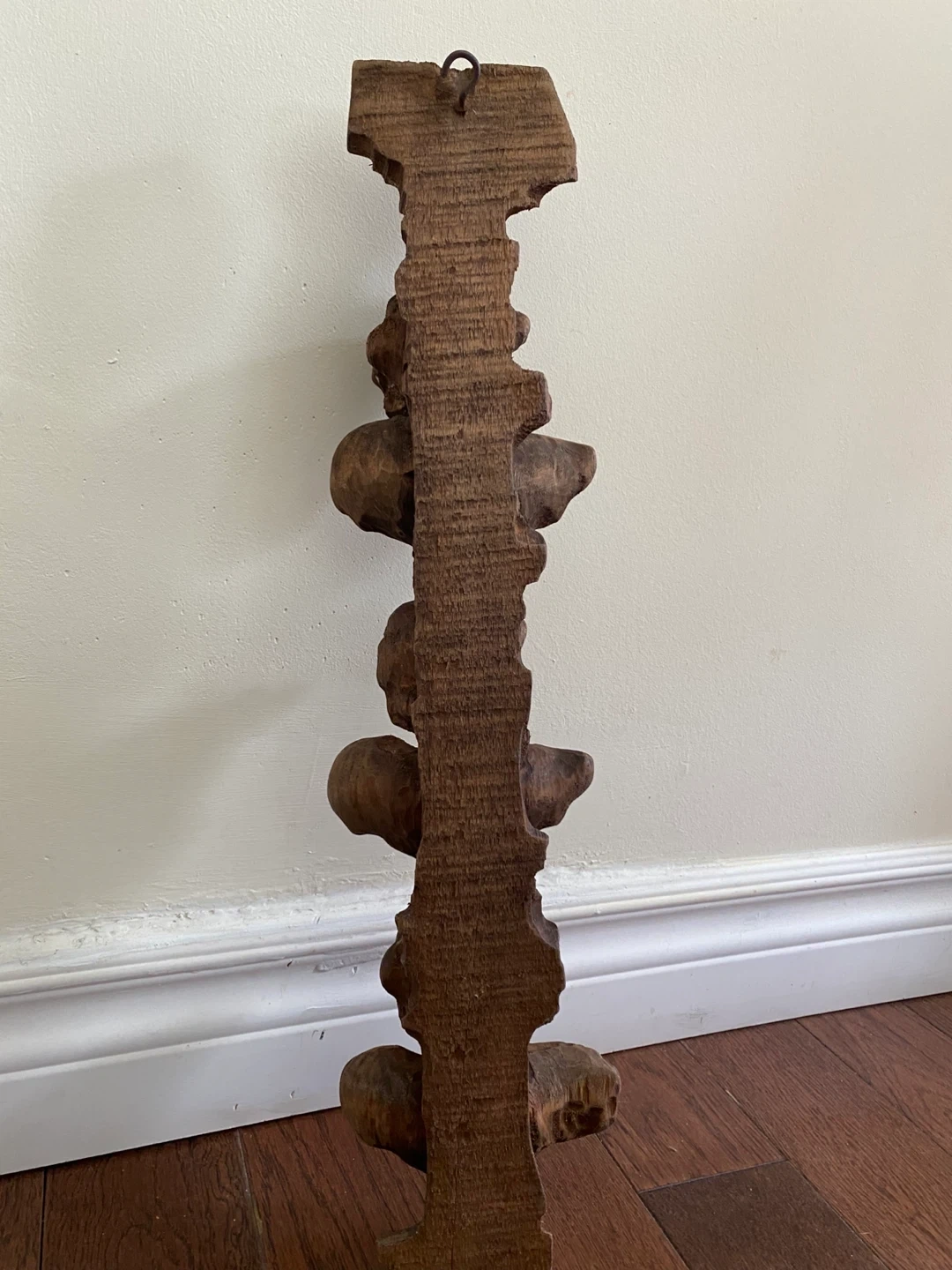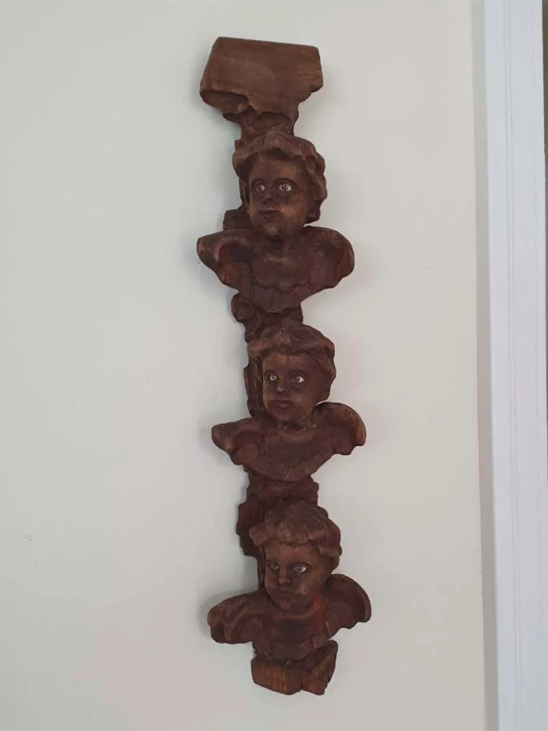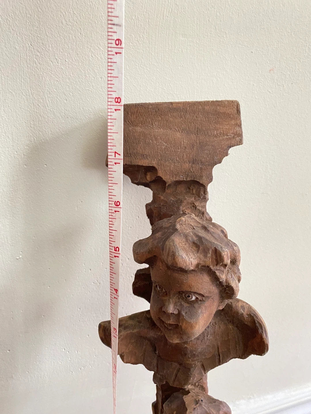 This antique wooden carving features three cherub faces stacked vertically. It's made of carved wood and measures approximately 18 inches in height. The piece has a hook on the back for hanging.