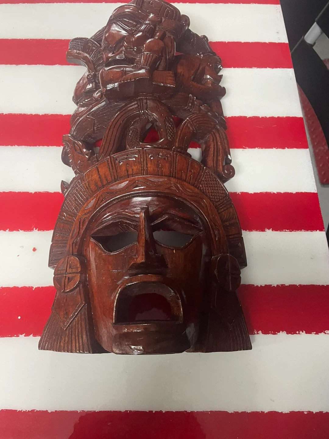 Hand carved wooden tribal mask. Features intricate carvings and a dark, rich finish. This decorative piece would add a unique touch to any home.