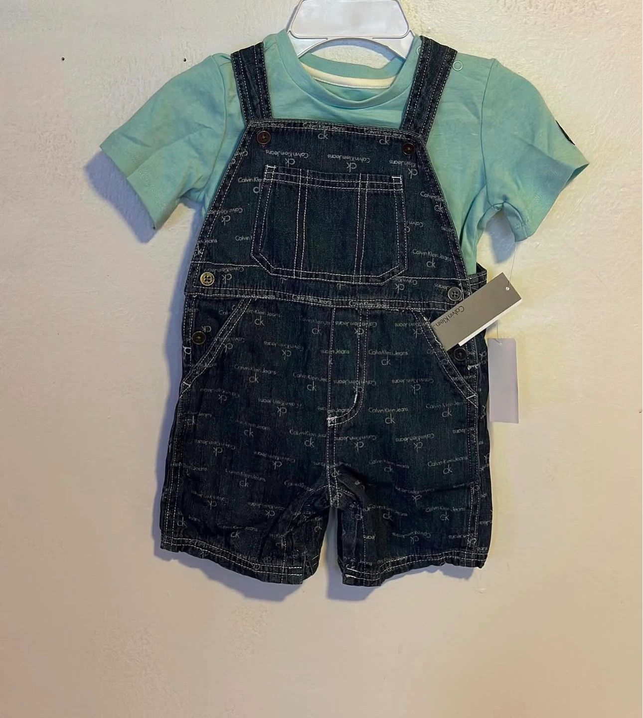 This adorable Calvin Klein outfit includes a soft, seafoam green T-shirt and denim-look overalls emblazoned with the CK logo, perfect for your little one! The outfit is brand new with tags.