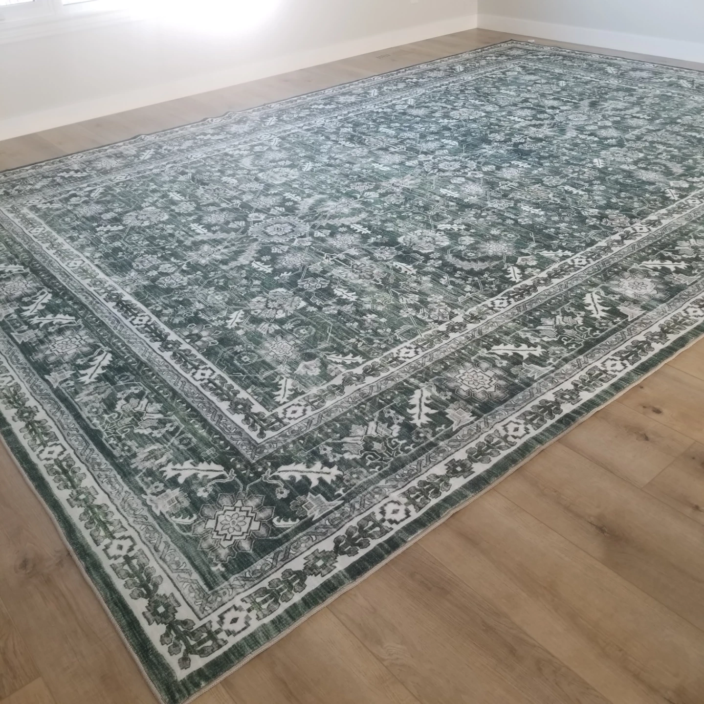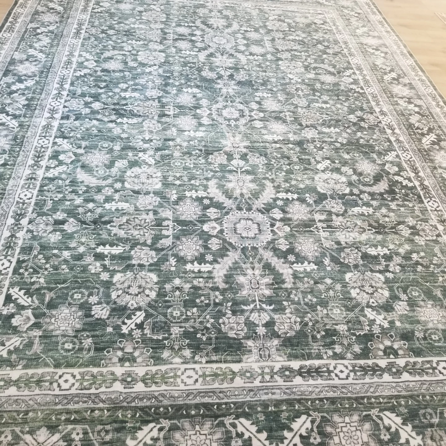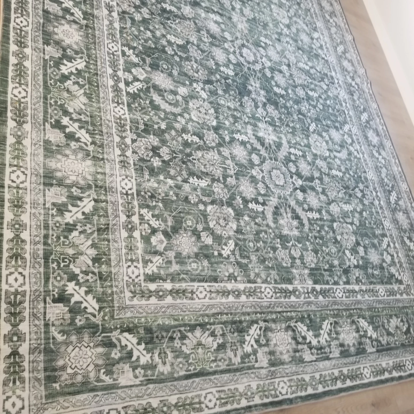This is a large area rug with a classic Persian-inspired design. It features a deep green base with intricate white and grey floral and geometric patterns. The rug has a distressed look, giving it a vintage feel. Its size makes it a great centrepiece for a living room or bedroom.