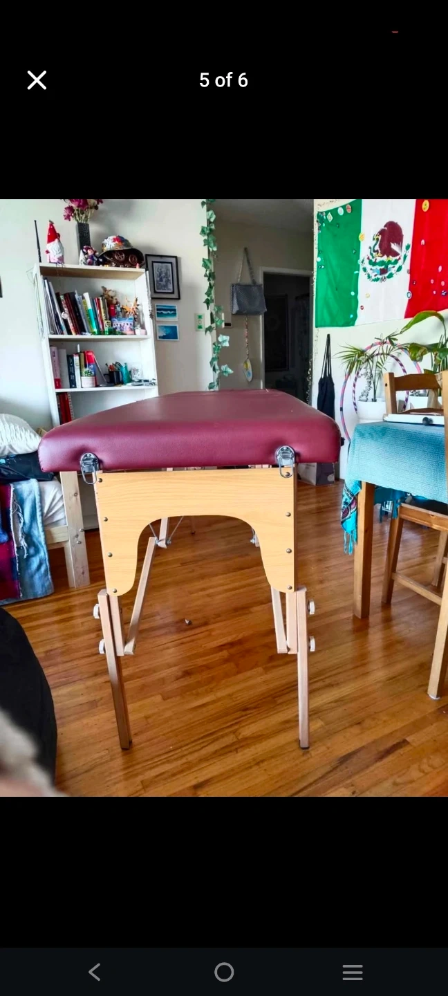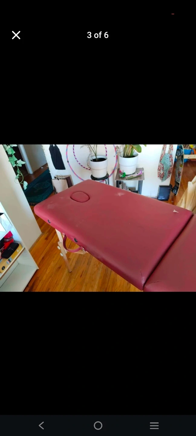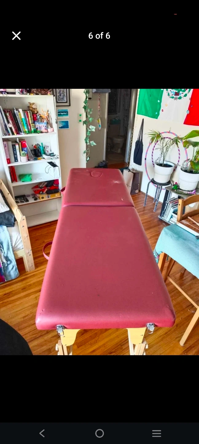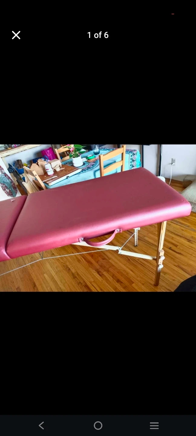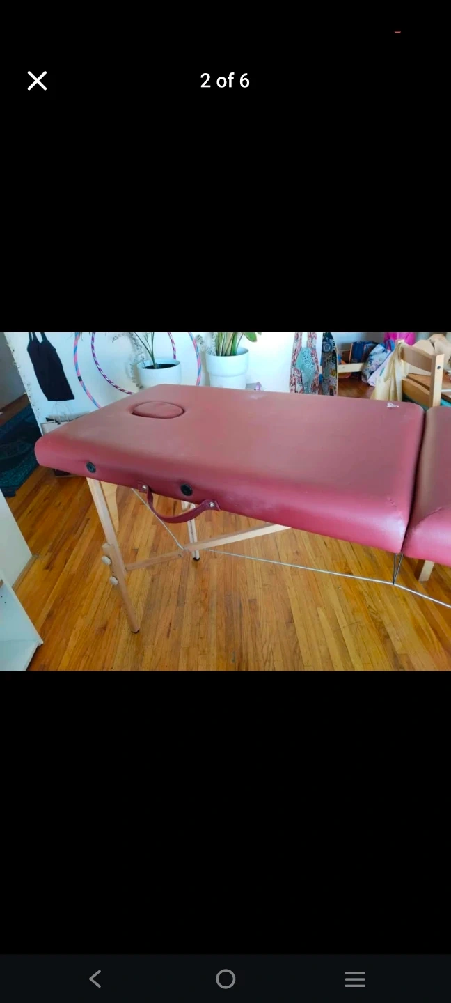 This is a portable massage table. It features a comfortable padded surface and a wooden frame. Includes a face cradle opening. Great for home or professional use!