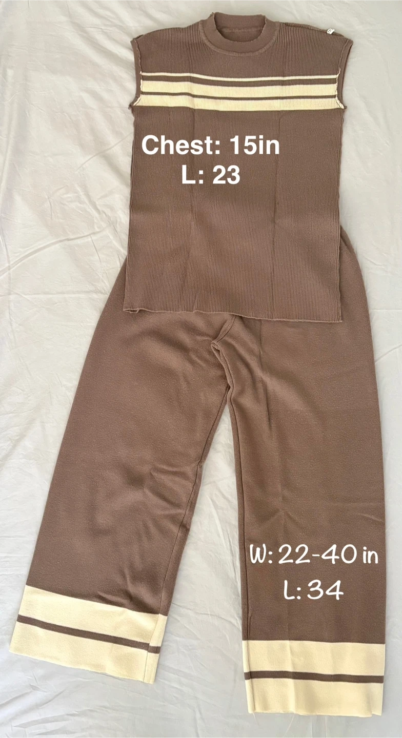 Cozy brown knit set! The sleeveless top has a chest measurement of 15 inches and a length of 23 inches. The pants have a waist that stretches from 22 to 40 inches and a length of 34 inches. Perfect for lounging or a casual day out