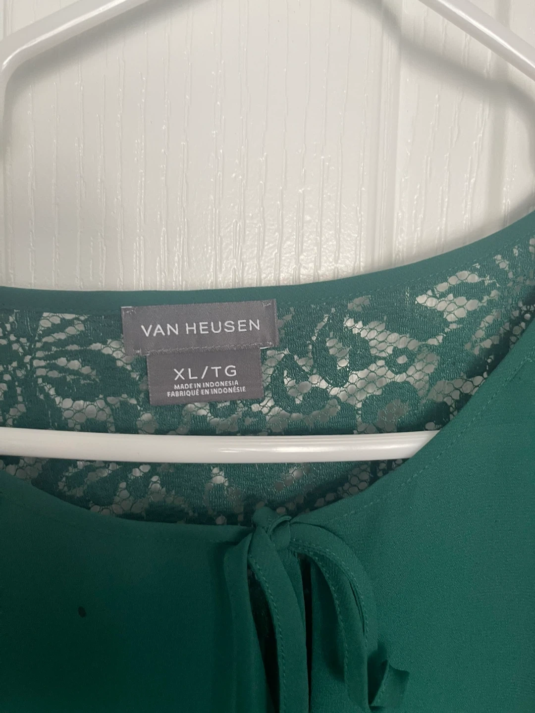 This Van Heusen blouse comes in a lovely emerald green shade. It features delicate lace detailing on the shoulders and neckline, with a tie closure at the front. The sleeves have a ruffled cuff for added style. It's a size XL/TG.