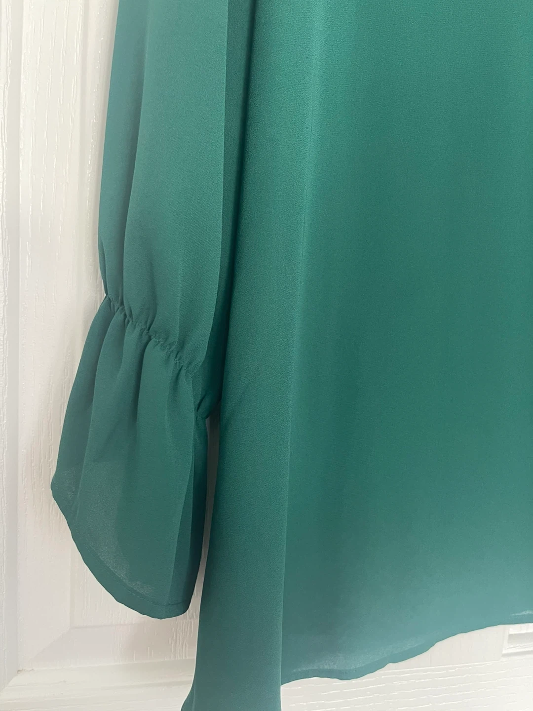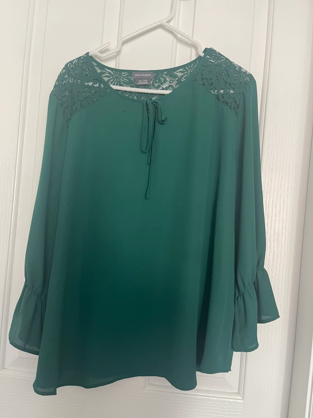 This Van Heusen blouse comes in a lovely emerald green shade. It features delicate lace detailing on the shoulders and neckline, with a tie closure at the front. The sleeves have a ruffled cuff for added style. It's a size XL/TG.