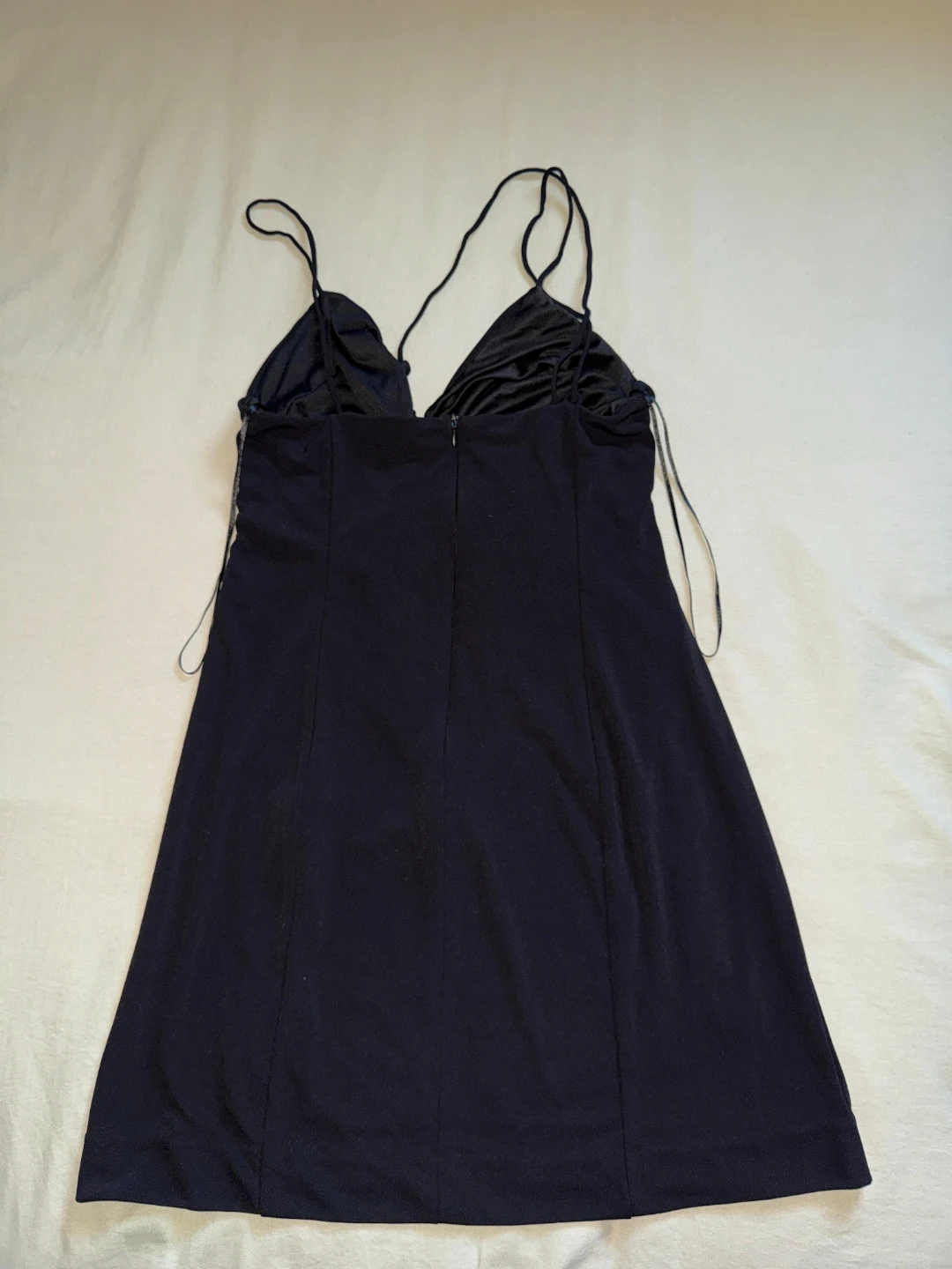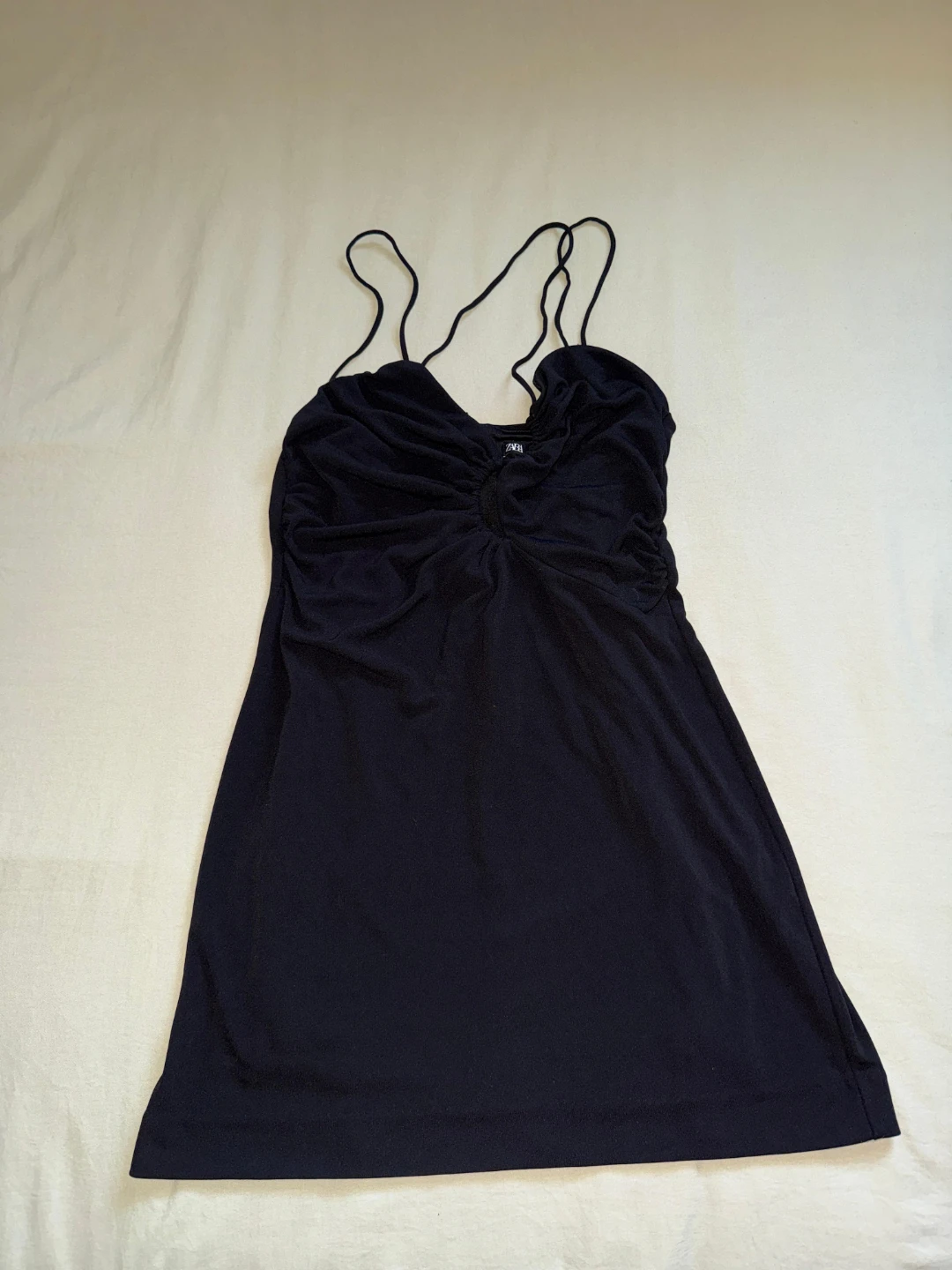 Selling a cute Zara black mini dress. It features thin straps and a ruched detail on the front. Perfect for a night out or a summer day!