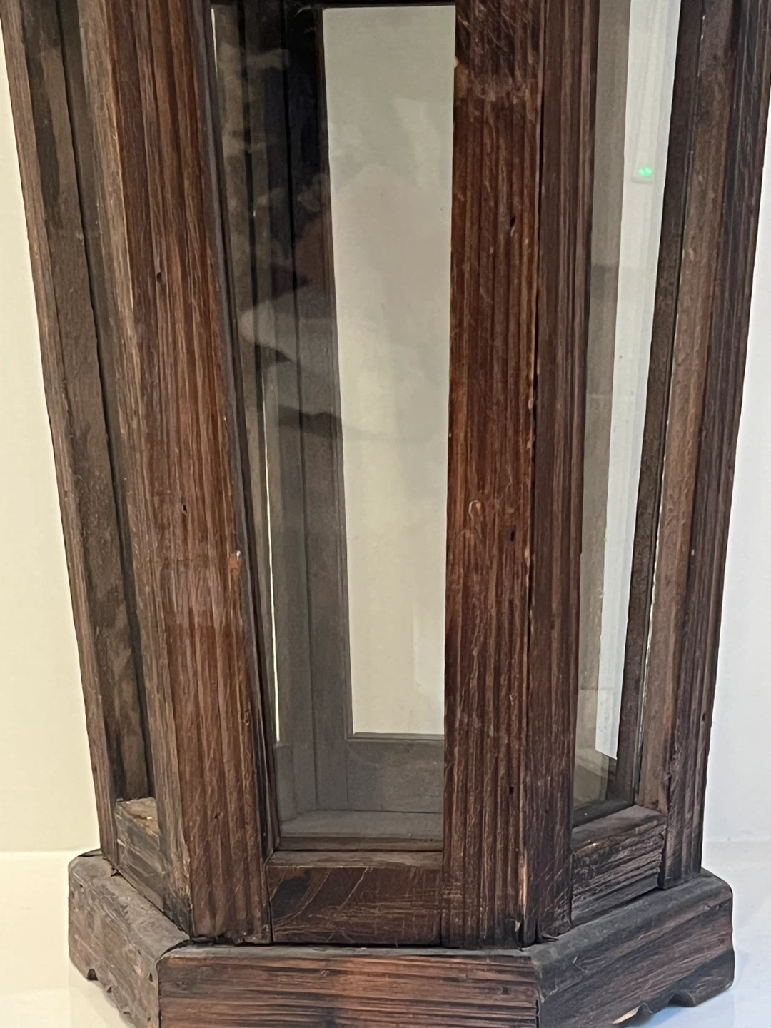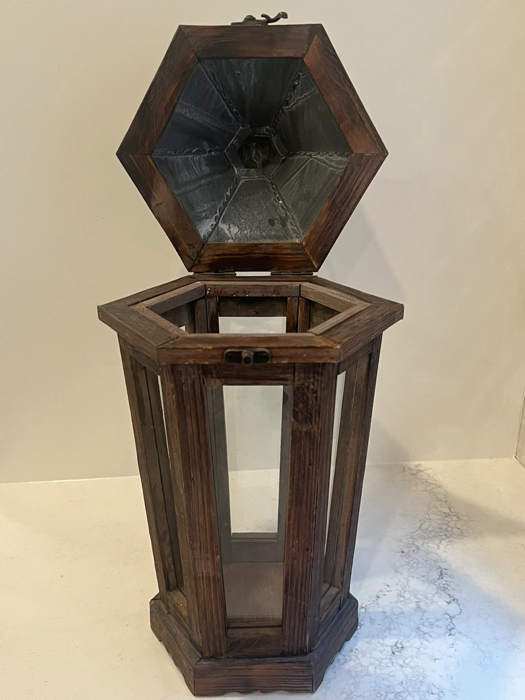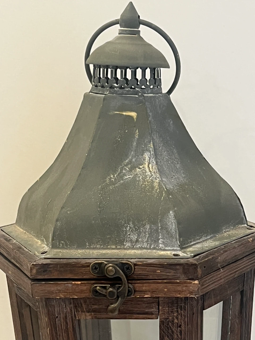 Vintage Park Hill Lantern composed of iron, cedar wood and glass from Pottery Barn. It has a rustic, farmhouse vintage feel and would look great indoors or in a covered outdoor space. The lantern has six glass panels, wood frame, a painted weathered gray finish top and a latch closure.