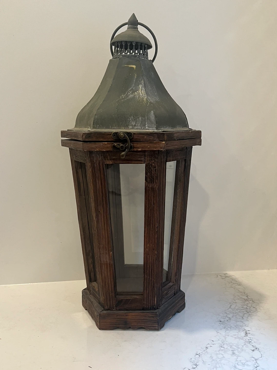 Vintage Park Hill Lantern composed of iron, cedar wood and glass from Pottery Barn. It has a rustic, farmhouse vintage feel and would look great indoors or in a covered outdoor space. The lantern has six glass panels, wood frame, a painted weathered gray finish top and a latch closure.