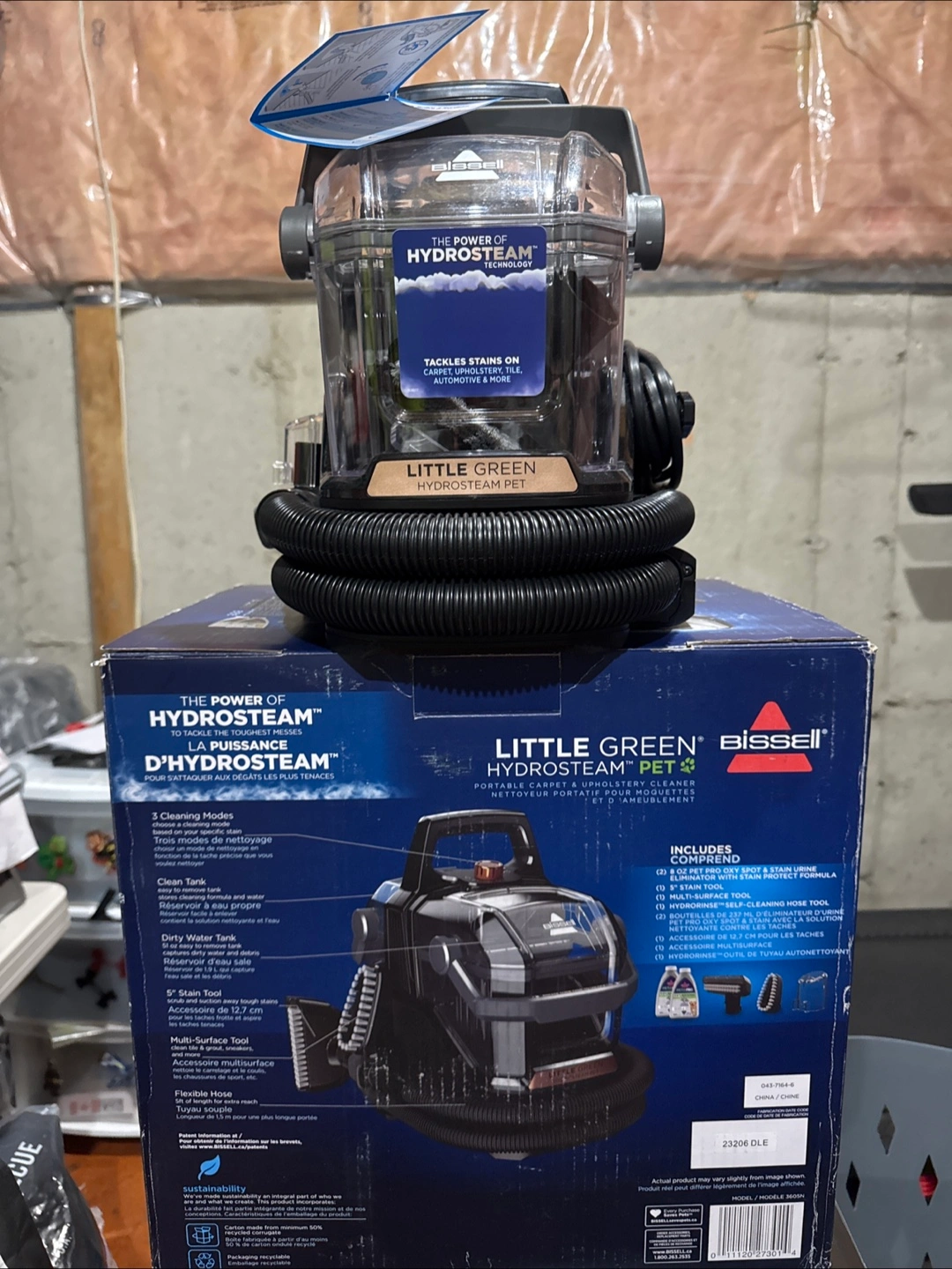 Selling a Bissell Little Green HydroSteam Pet portable carpet and upholstery cleaner! It tackles stains on carpet, upholstery, tile, automotive and more. Includes a stain tool, multi-surface tool, and a flexible hose. Comes with the box!
