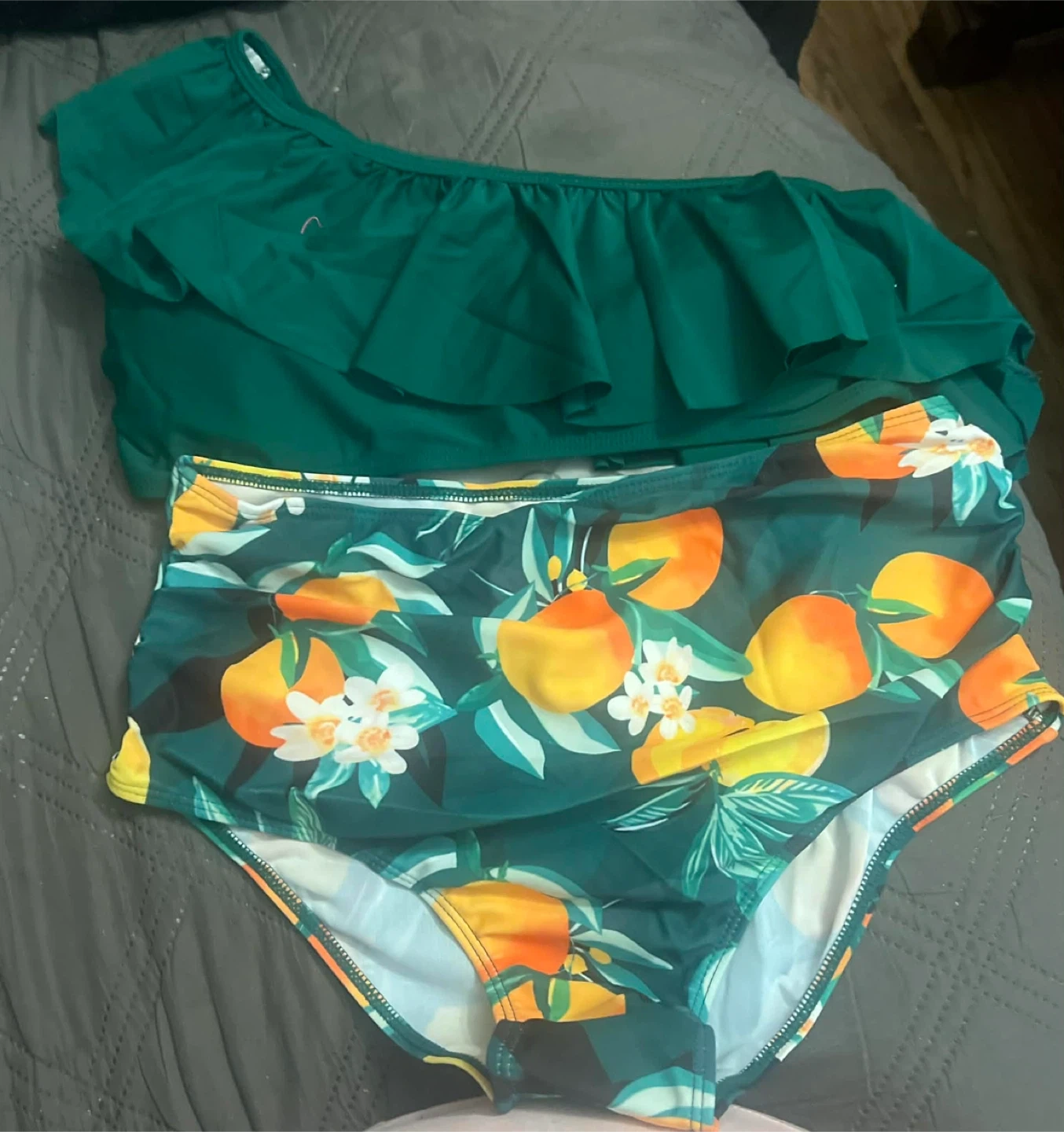 This is a two-piece swimsuit with a one-shoulder top and high-waisted bottoms. The design features a green base with a vibrant orange and floral print. It's a stylish choice for beach days or pool lounging!