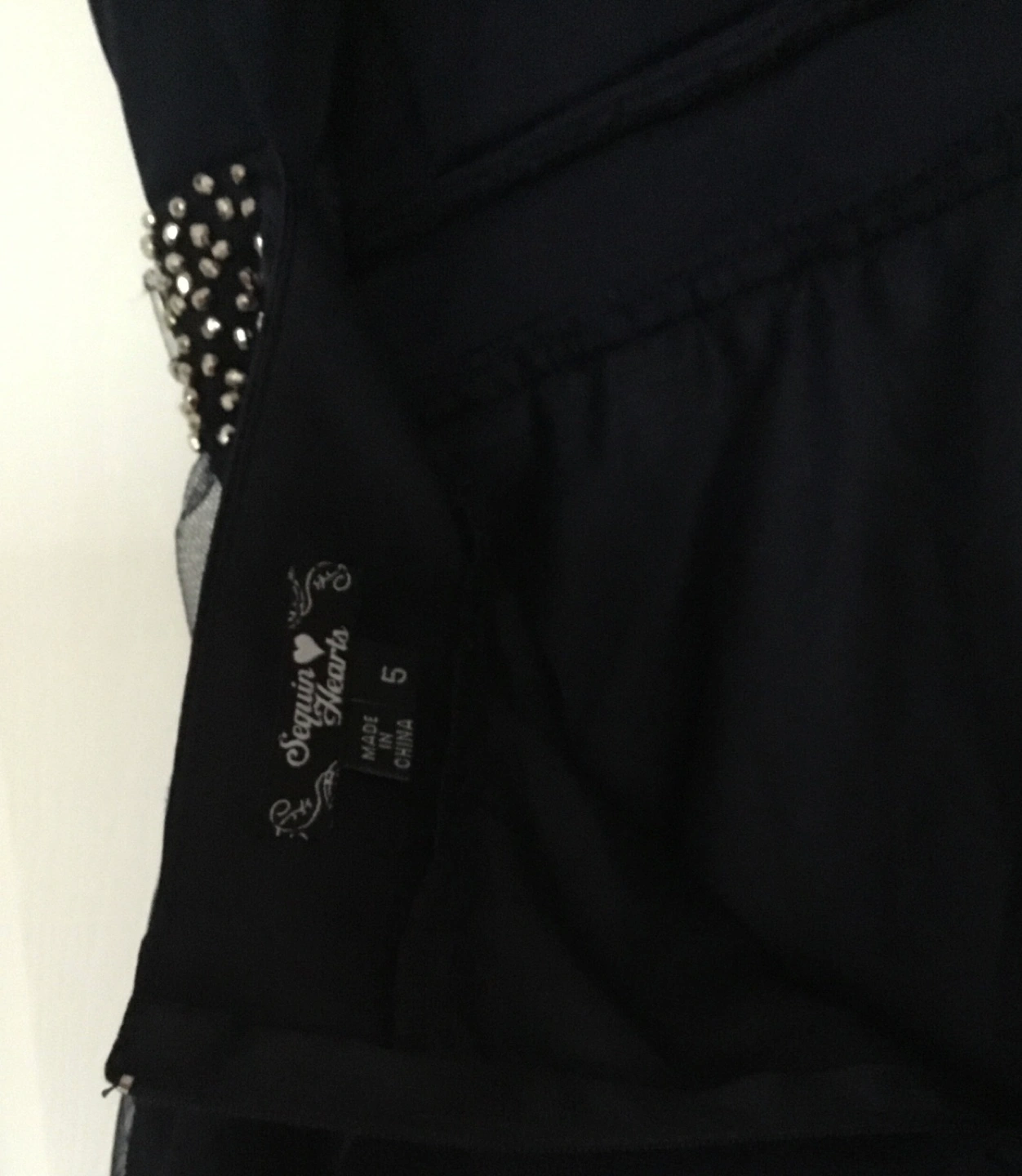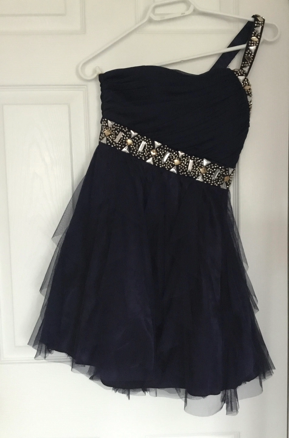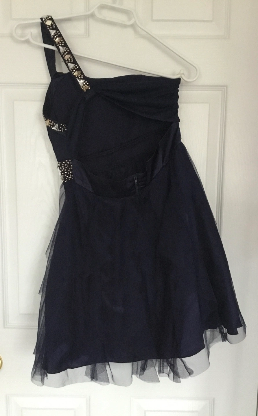 Navy blue one shoulder dress with a beaded strap and a layered tulle skirt. The dress is sleeveless and has a zipper in the back.