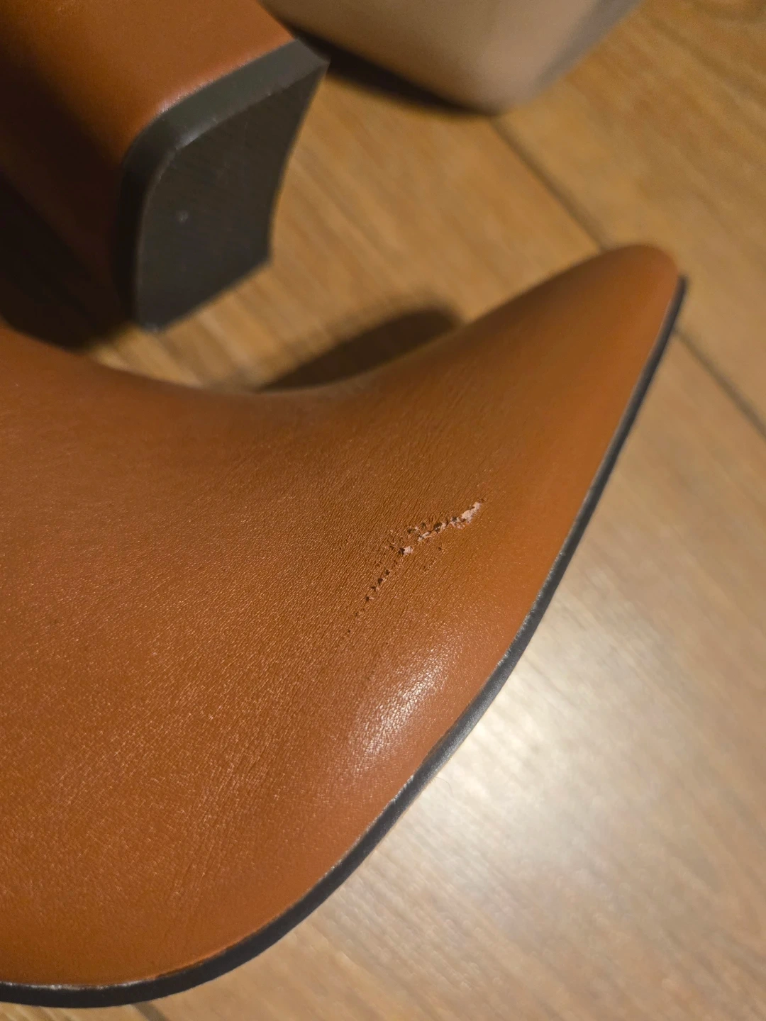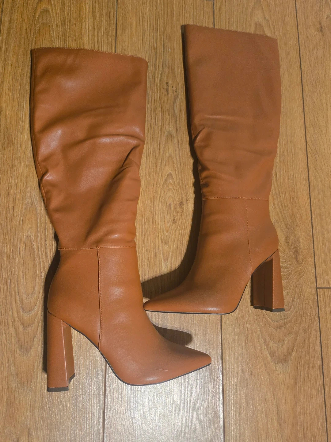These brown knee-high boots are made from faux leather with a side zipper. They feature a pointed toe and a chunky block heel. There's a small scuff on the toe of the right boot.
