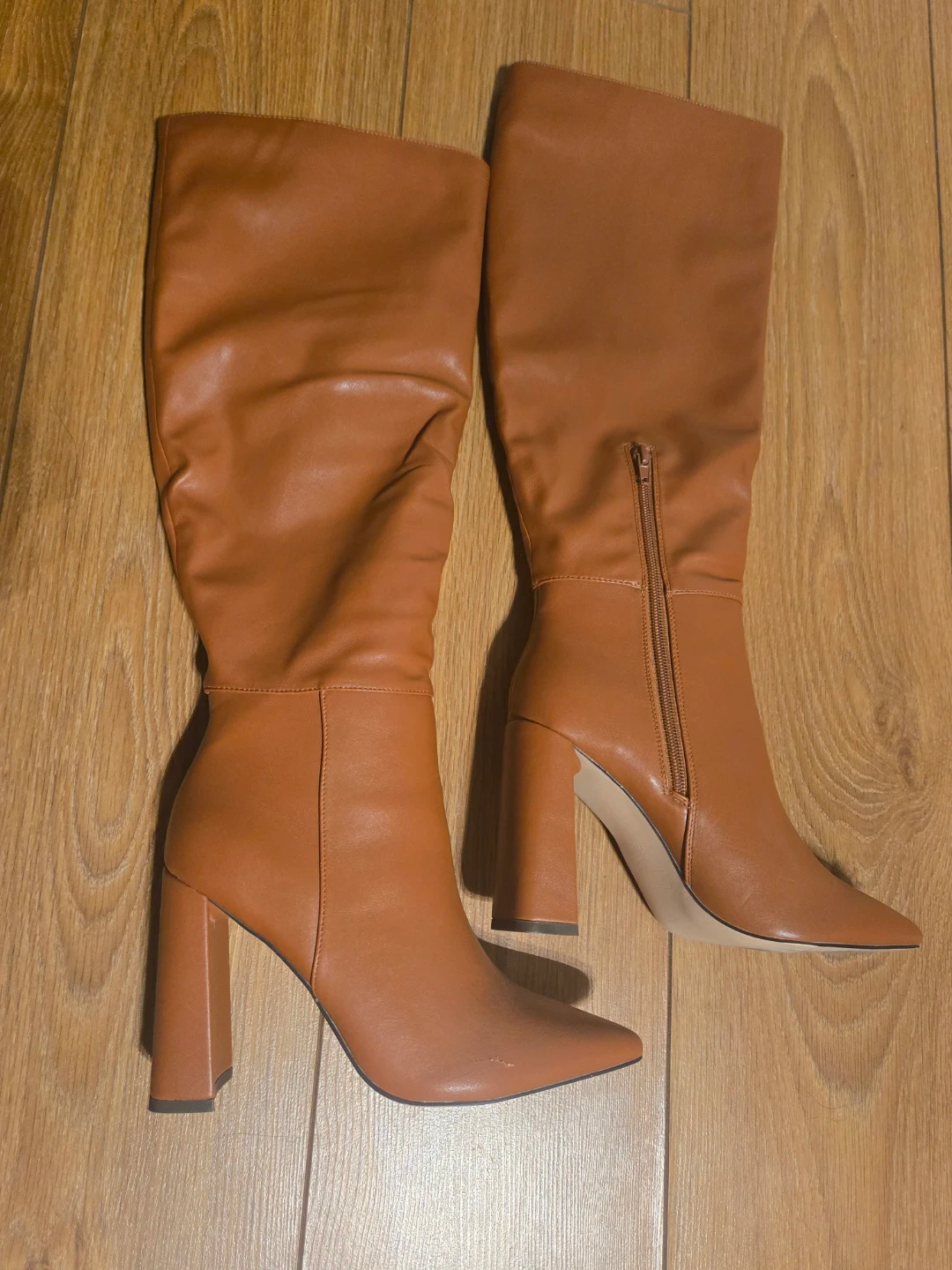 These brown knee-high boots are made from faux leather with a side zipper. They feature a pointed toe and a chunky block heel. There's a small scuff on the toe of the right boot.