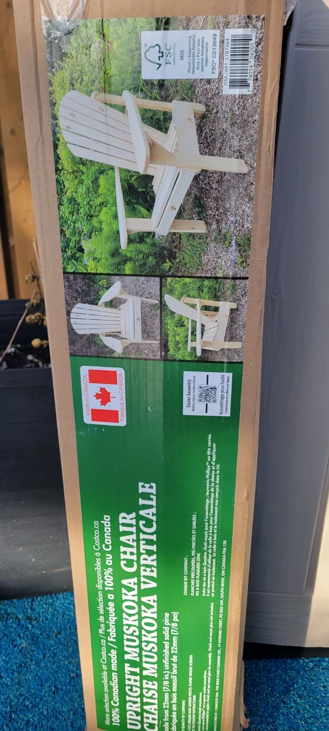 I'm selling an upright Muskoka chair. I stained each piece before assembly. I also glued the pieces together before installing the screws (makes it more solid and last longer). I bought this at the end of last season and stored it in my garage over the winter. We decided to purchase the lounge version instead.