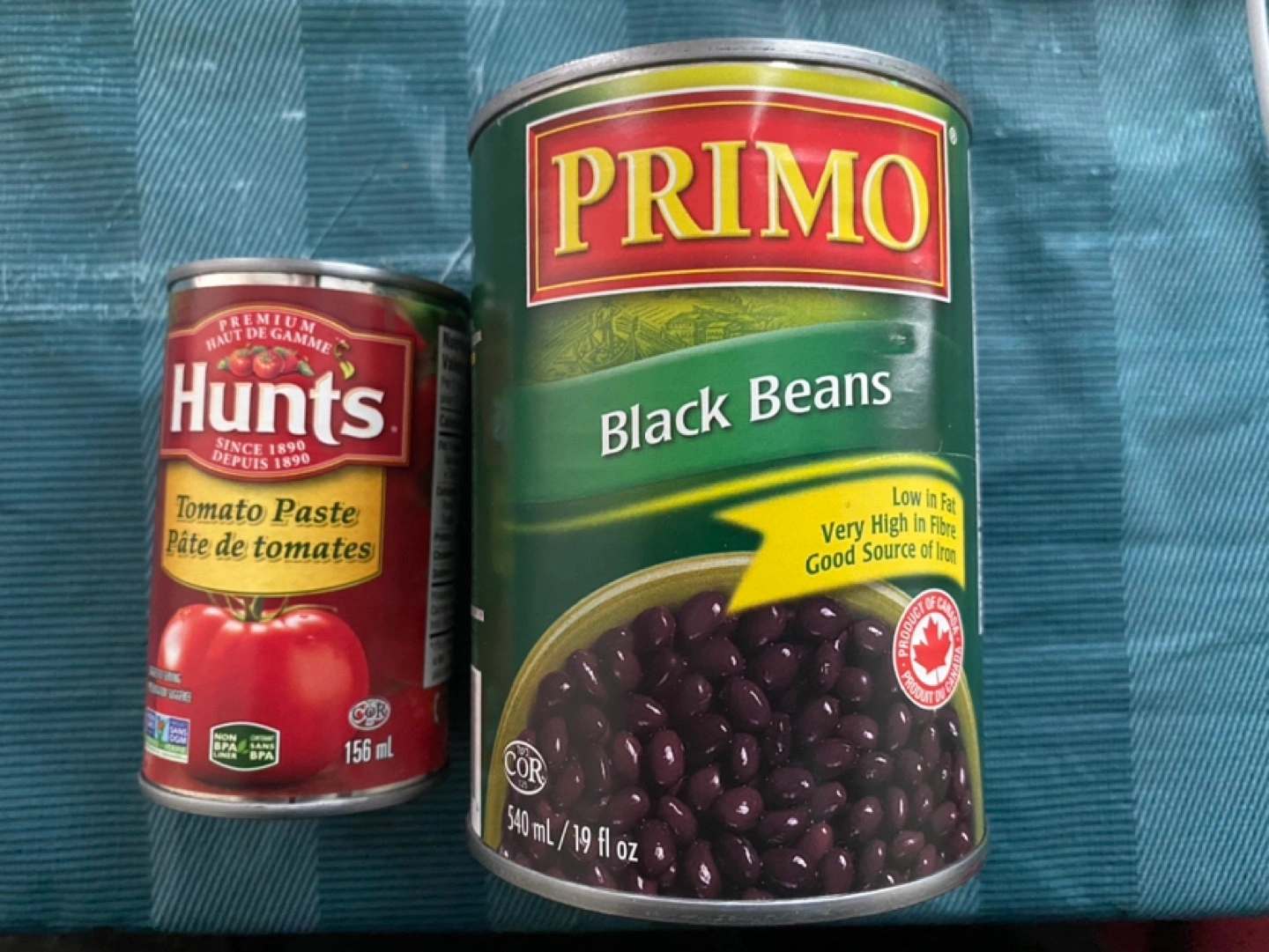Unopened Cans of Tomato Paste (156 ml) and Black Beans (540 ml)