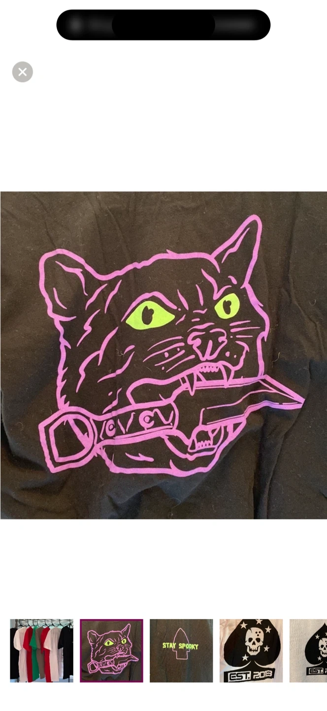 Assorted graphic t-shirts featuring unique designs. Includes a pink cat with a knife, a skeleton with a hat, and an ace of hearts with a heart. Made from 100% cotton. Sz S NWOT. Unigender. Teens. Black, white, green and red available.