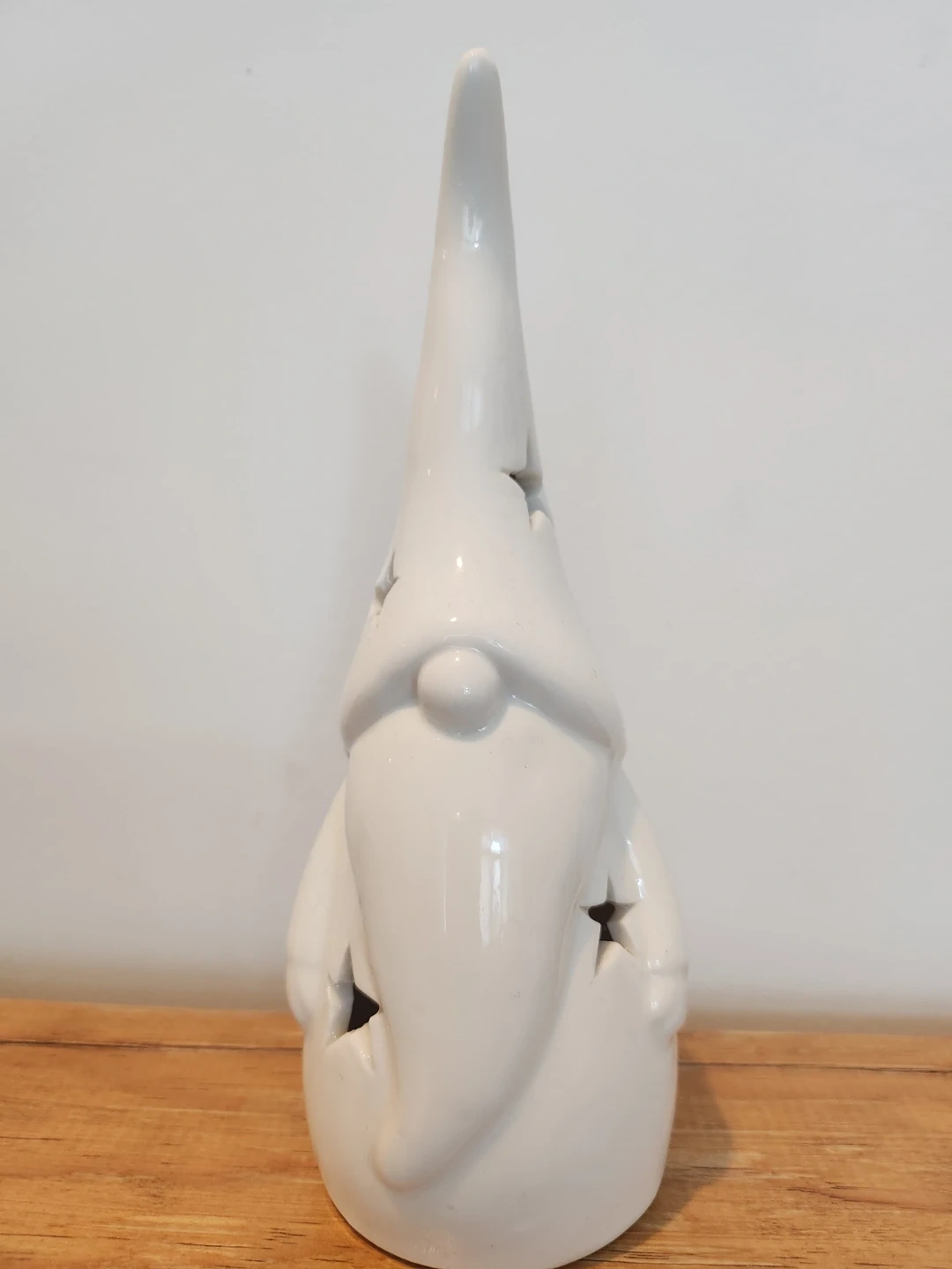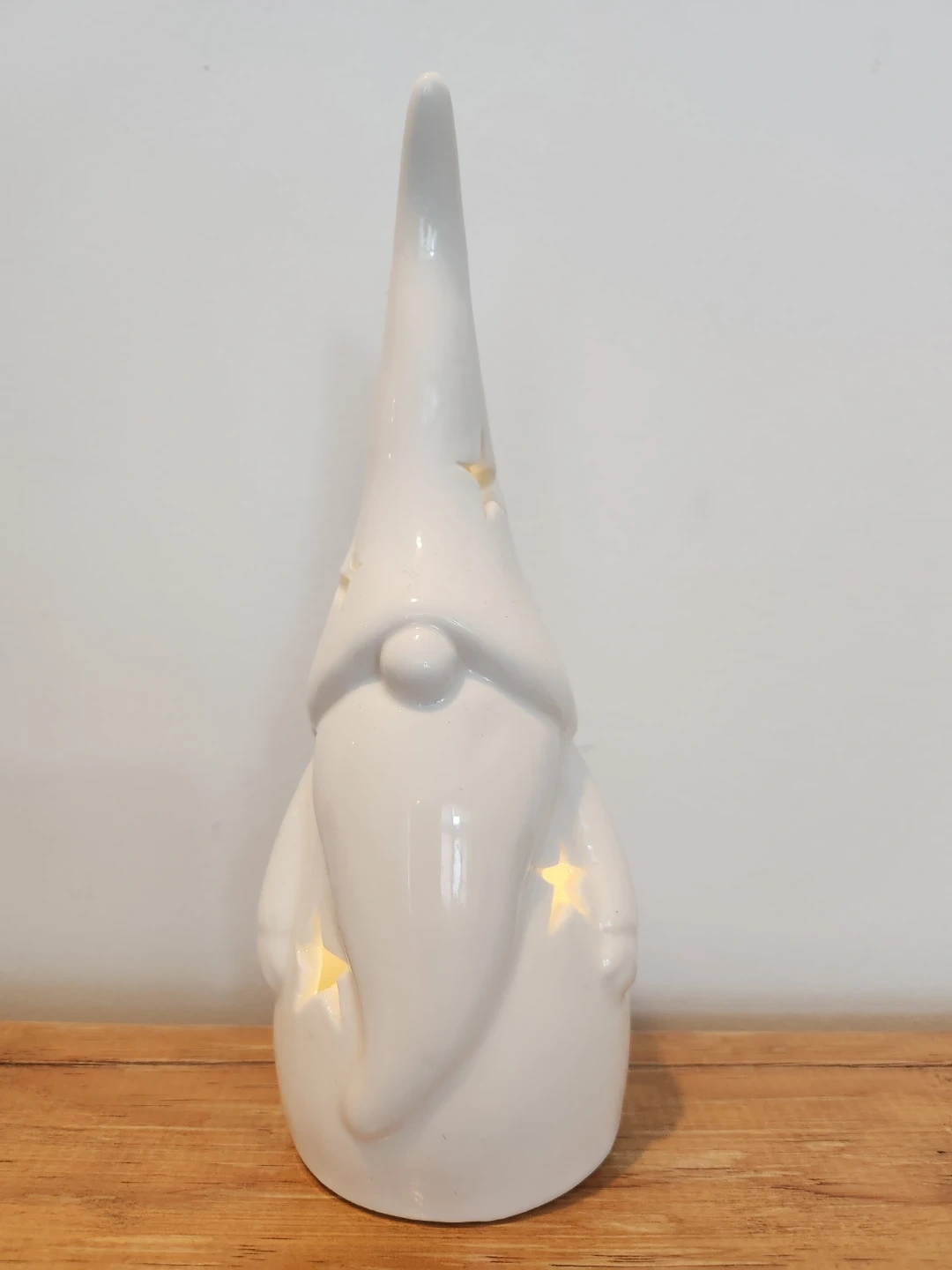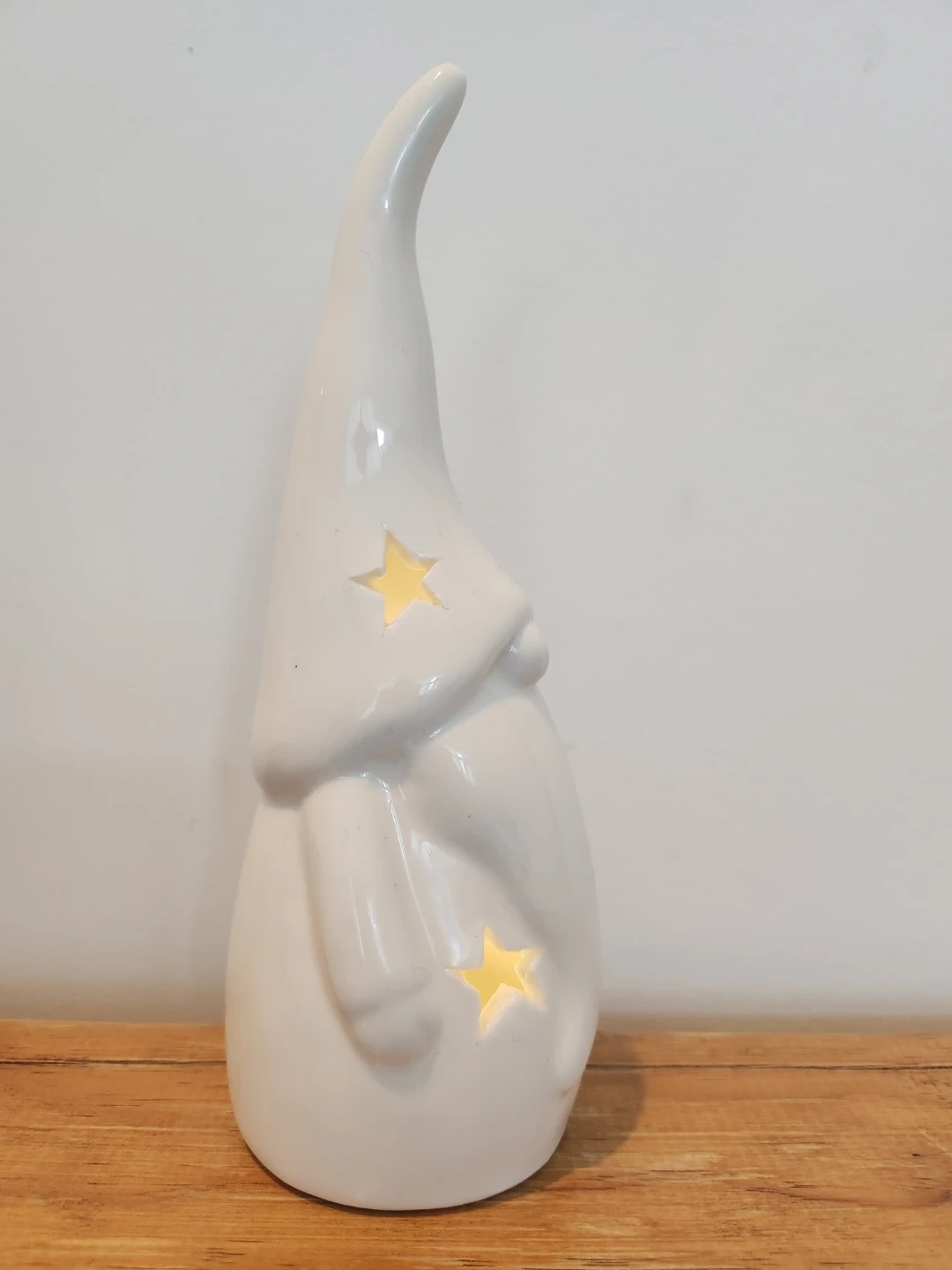 A cute white ceramic gnome lantern with star cutouts. It's perfect for adding a cozy glow to any room. Ceramic material. Batteries included.