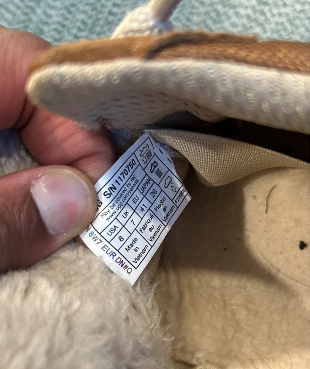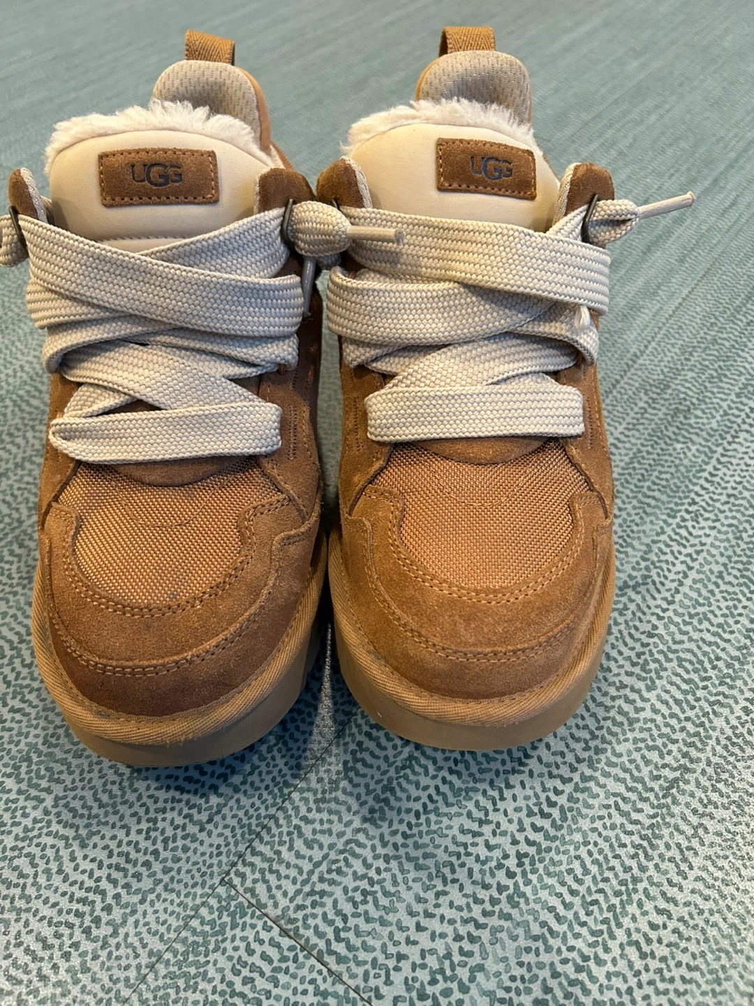 Cozy UGG chukka boots in a rich brown suede. They feature a warm fur lining for comfort. Laces are light grey. Made in Vietnam.