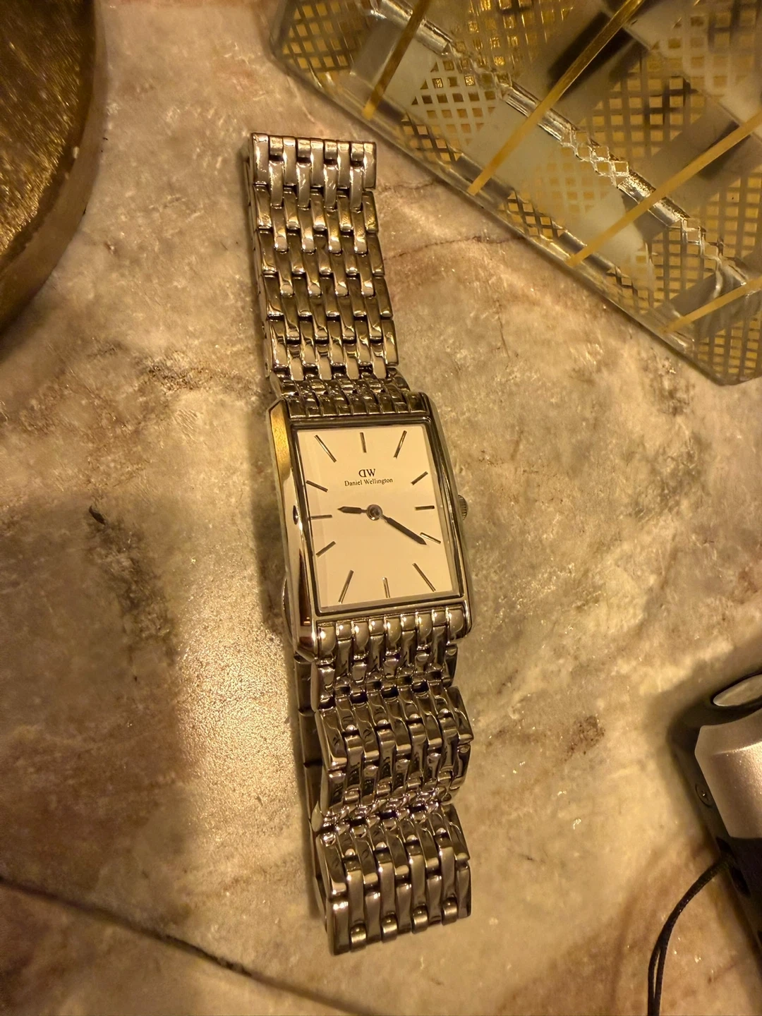 A stylish Daniel Wellington watch with a rectangular face and a silver-toned metal band. It's a classic accessory that pairs well with any outfit. Features a clean white dial with minimalist hour markers.