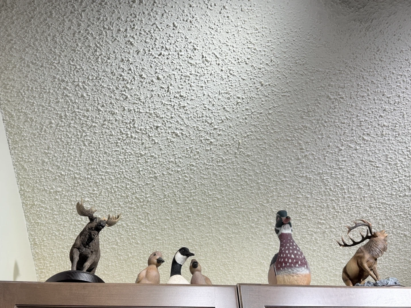 A collection of decorative figurines featuring a wood duck and two Canada geese. These detailed pieces are perfect for adding a touch of nature to your home decor. They'd make a lovely addition to a mantel or shelf! Bigger pieces $15 each and small three ducks group $20.