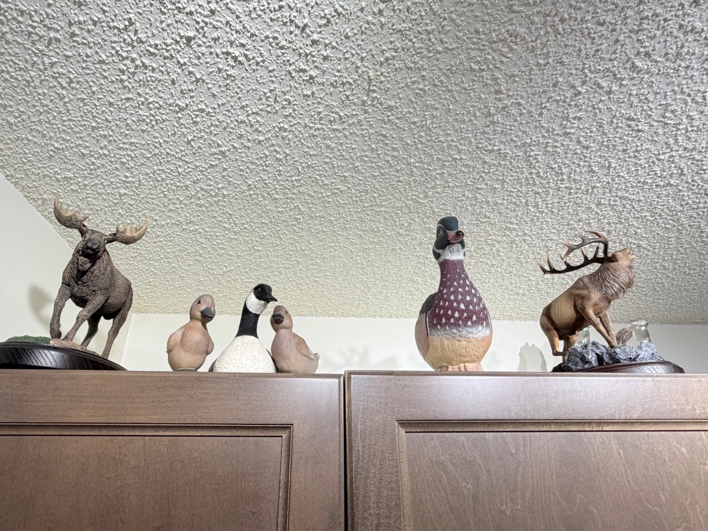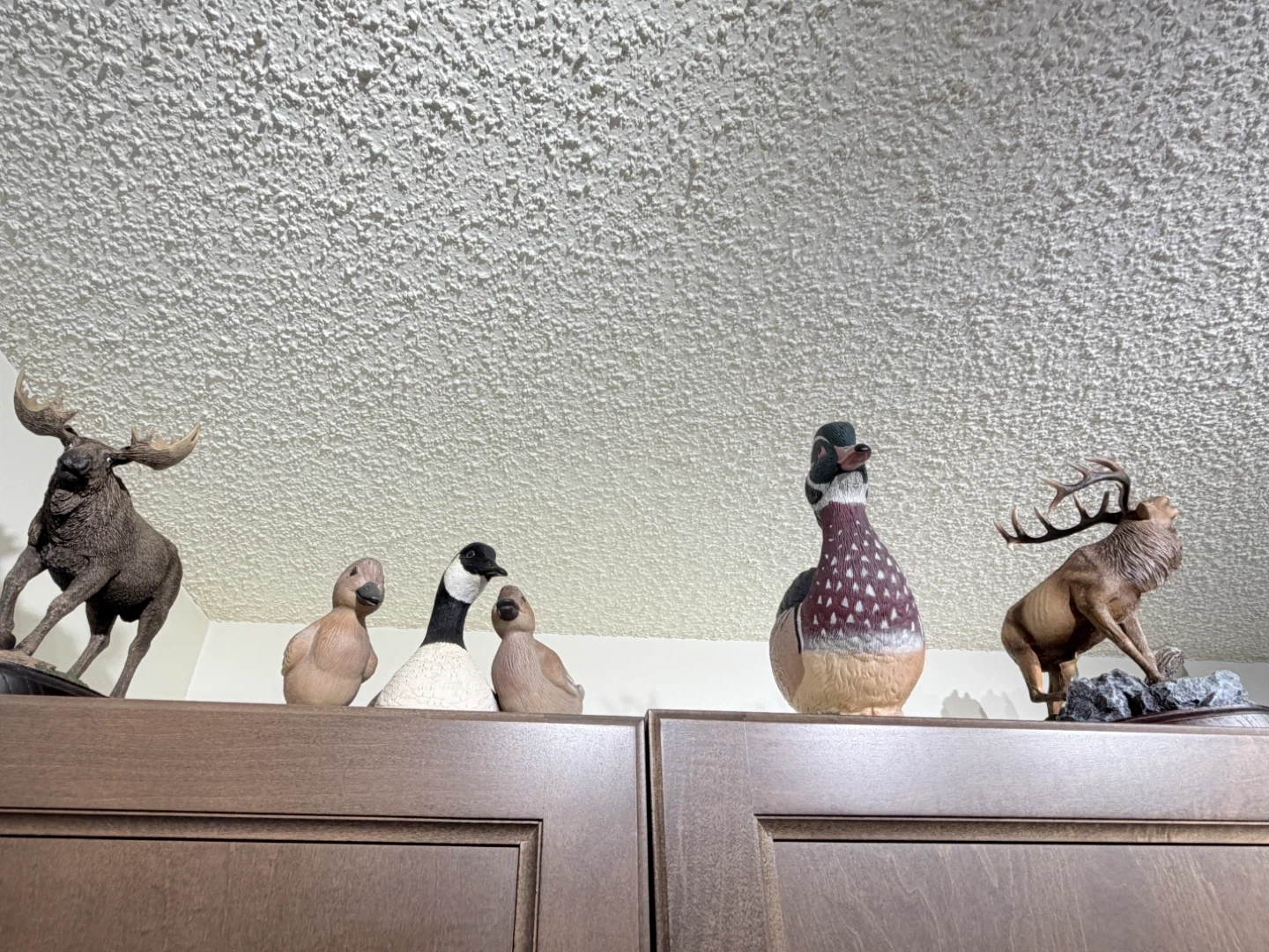 A collection of decorative figurines featuring a wood duck and two Canada geese. These detailed pieces are perfect for adding a touch of nature to your home decor. They'd make a lovely addition to a mantel or shelf! Bigger pieces $15 each and small three ducks group $20.