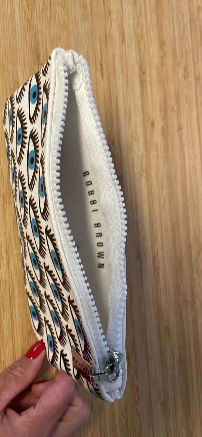Super cute Bobbi Brown zip pouch with a fun eye design! It's in great condition and perfect for carrying your essentials. Approximately 5 inches wide and 4 inches tall