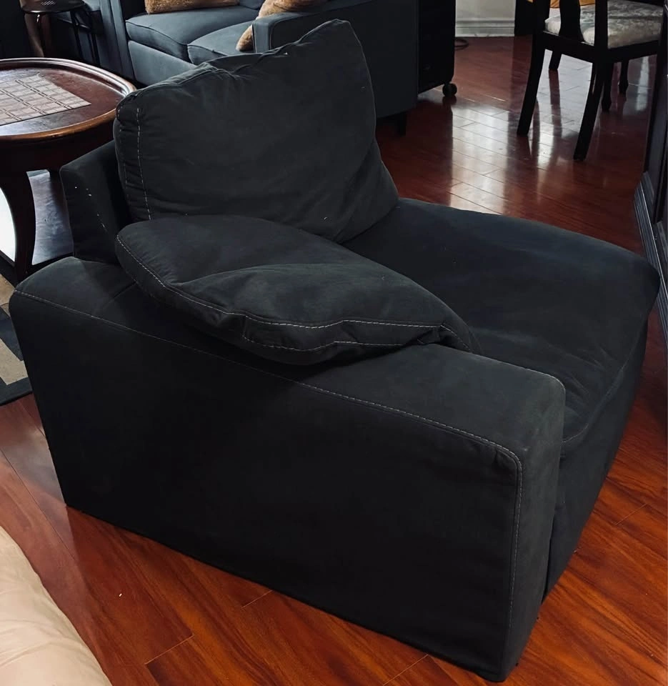 I'm selling a used Restoration Hardware Cloud Chair, perfect for sinking into after a long day! This chair features a deep seat and plush cushions, making it relaxing & comfortable.