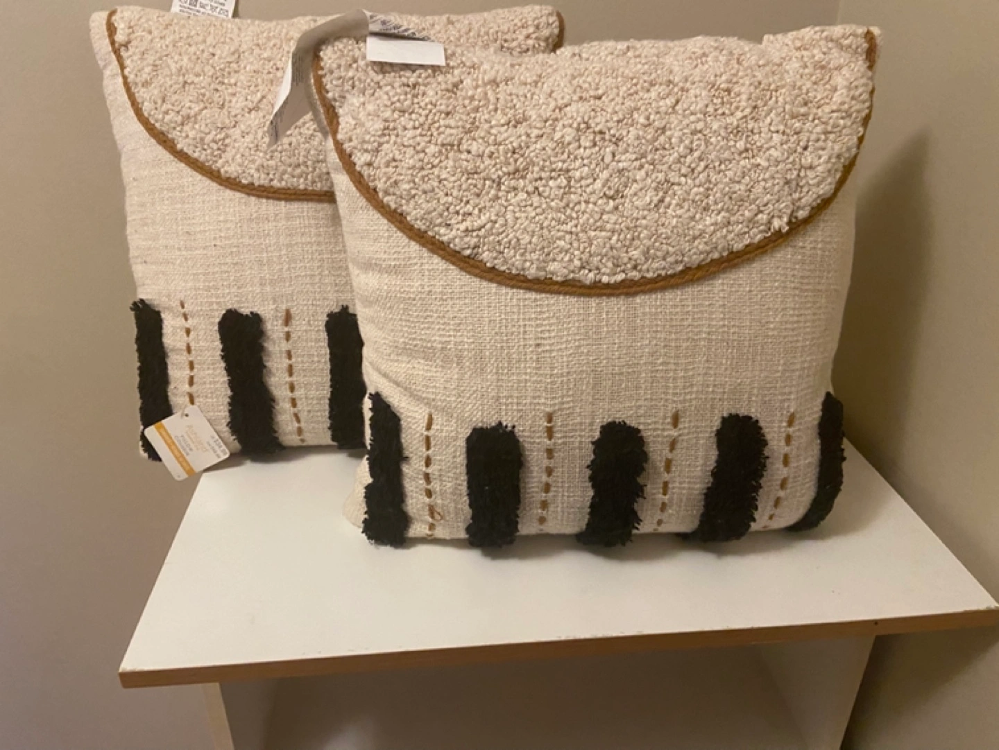 Pair of off-white throw pillows. Features black and tan accents. Textured fabric. Modern design.