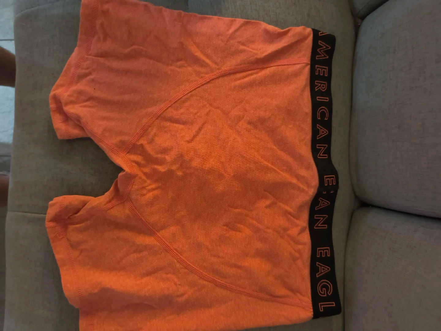 These are orange boxer briefs from American Eagle. They're made of a soft, stretchy material for comfort. Elastic waistband with brand lettering.
