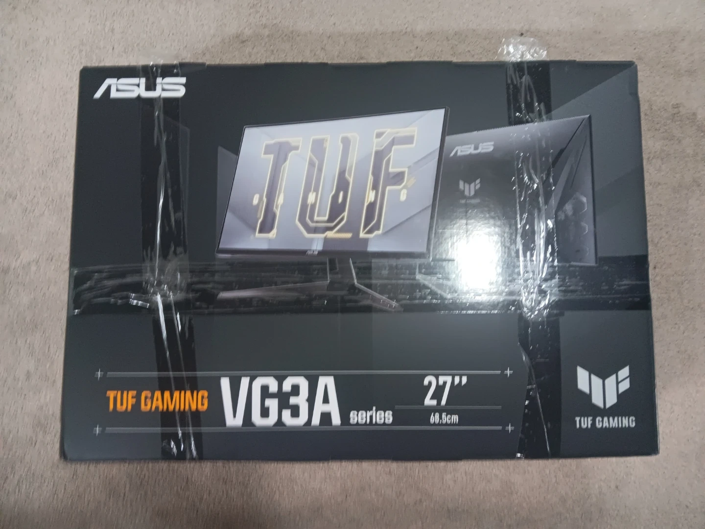 This is an ASUS TUF Gaming VG3A monitor. It's a 27-inch display with a 68.5cm screen size. The box is taped shut, indicating it's likely new or unopened.