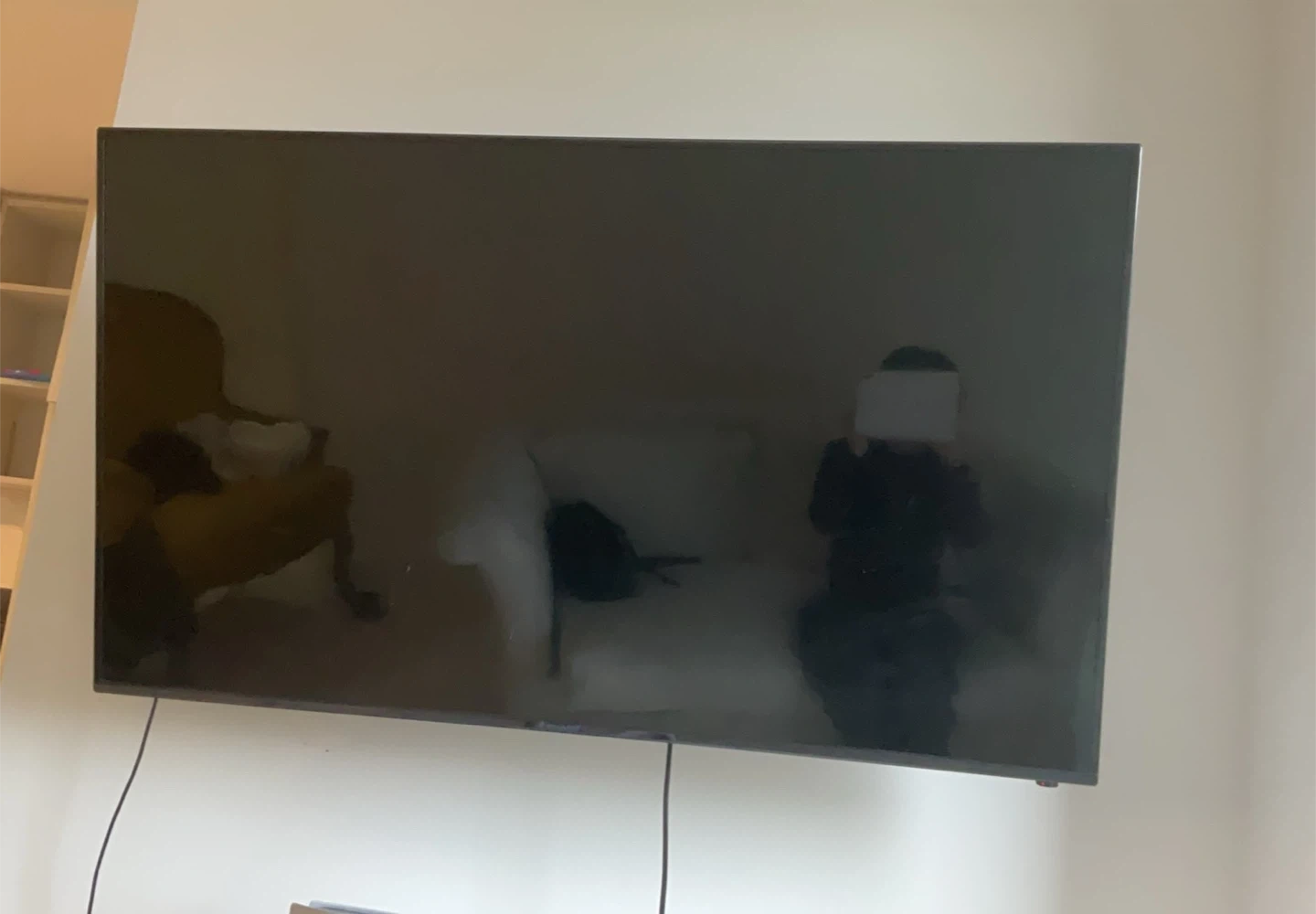 This is a black flat-screen television. It's a modern display for your home entertainment needs. It comes with necessary cables and a wall extension.