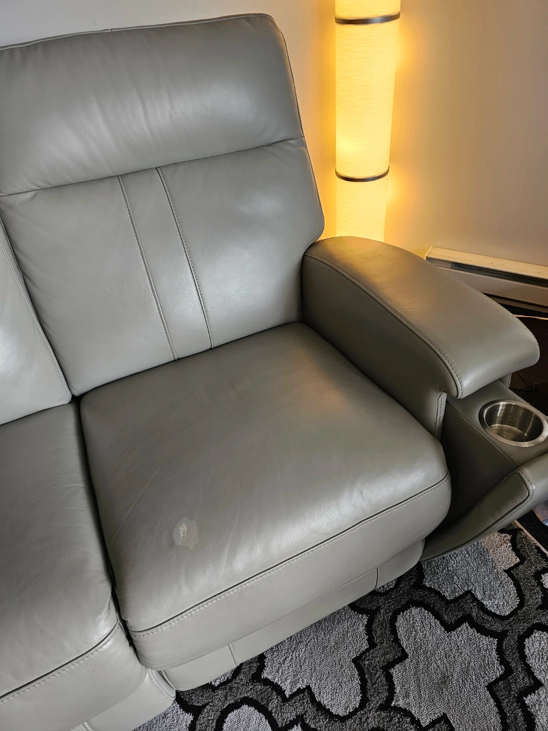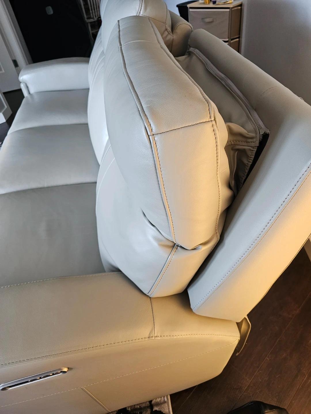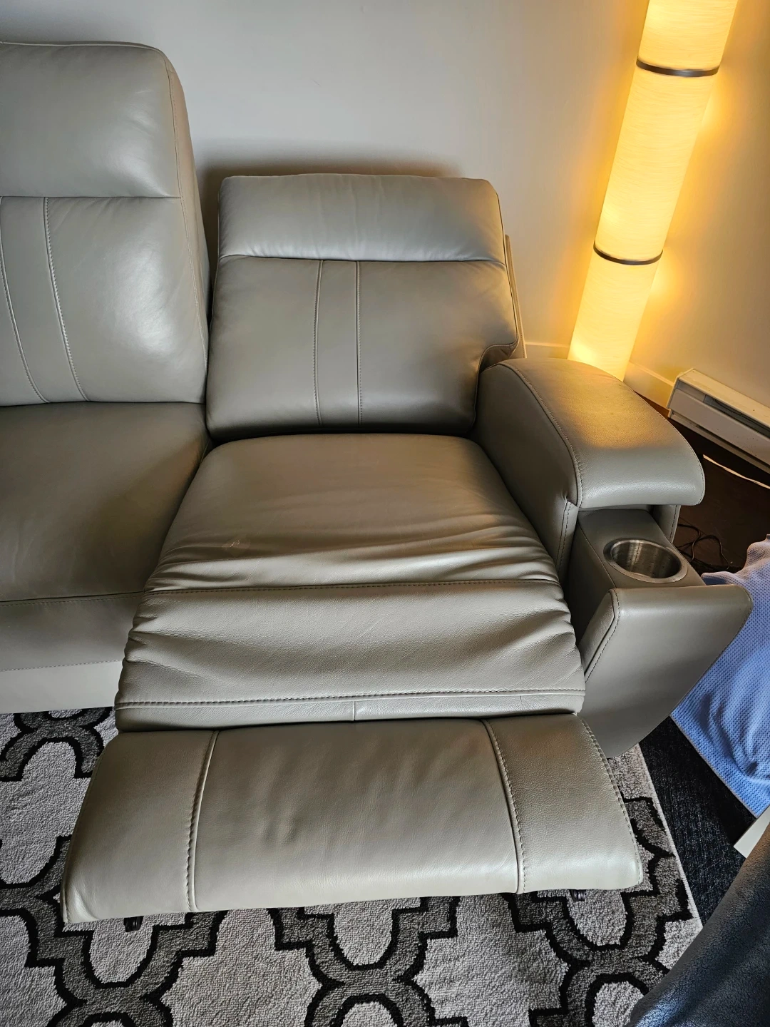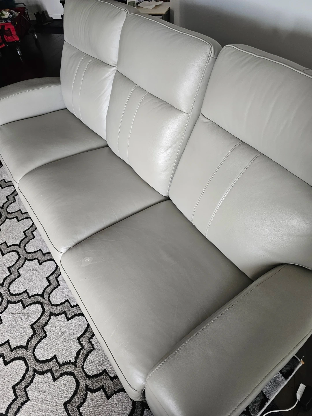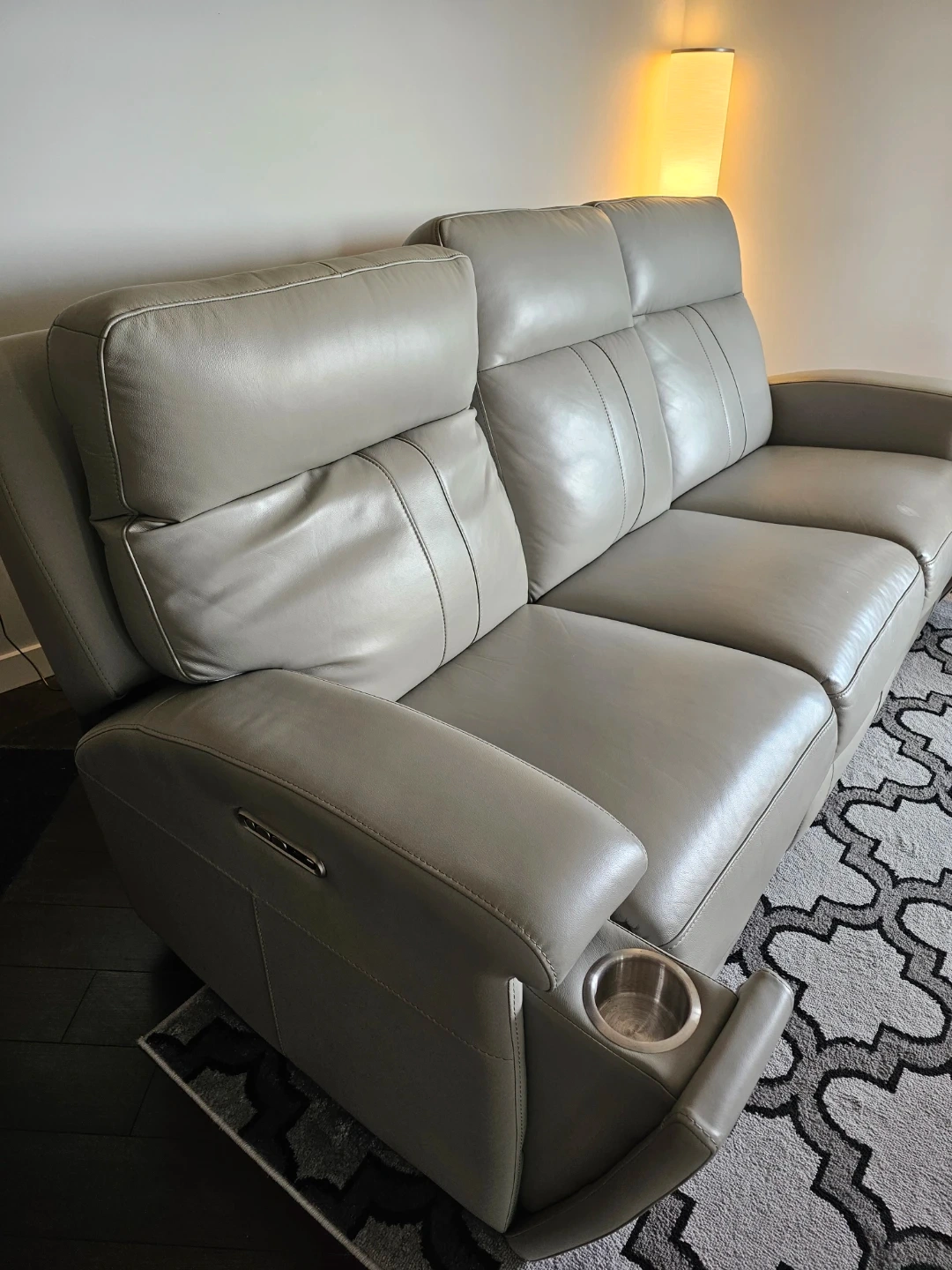 This grey leather power reclining sofa is in good condition, though it does show a small mark on the seat. It features built-in cup holders for convenience. Head rests are also power reclining. Perfect for setting up a cozy home theatre experience!