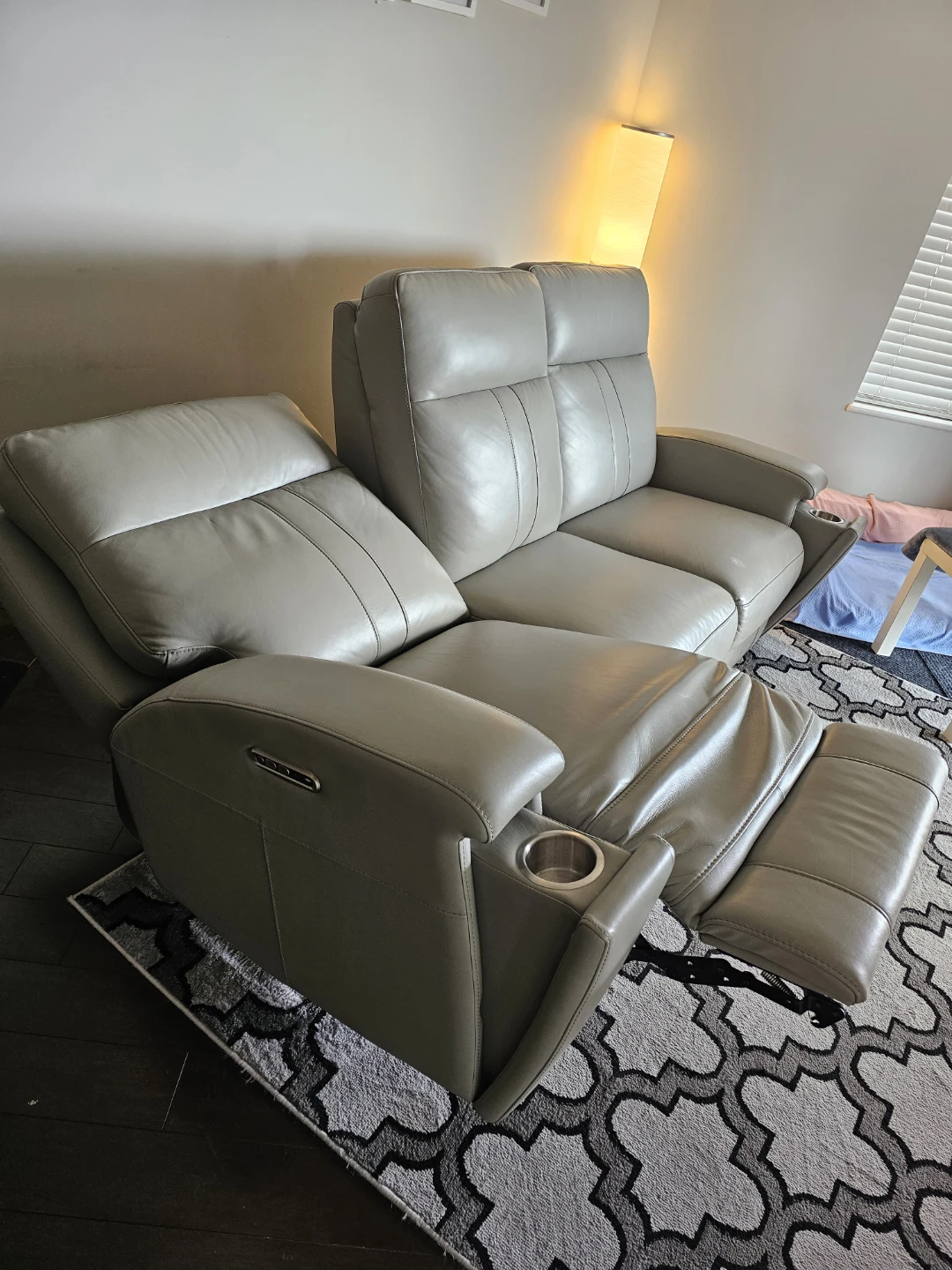 This grey leather power reclining sofa is in good condition, though it does show a small mark on the seat. It features built-in cup holders for convenience. Head rests are also power reclining. Perfect for setting up a cozy home theatre experience!