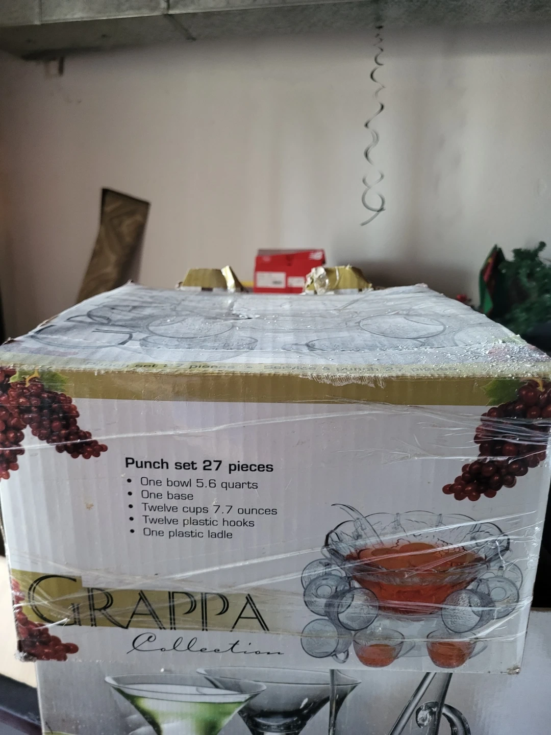 This GRAPPA Collection punch set includes one 5.6 quart bowl and a base. It comes with twelve 7.7 ounce cups, twelve plastic hooks, and one plastic ladle. Perfect for serving drinks at your next get-together!