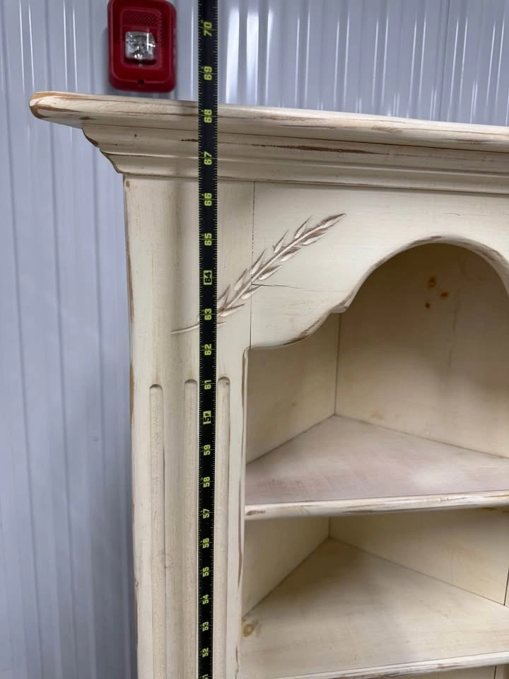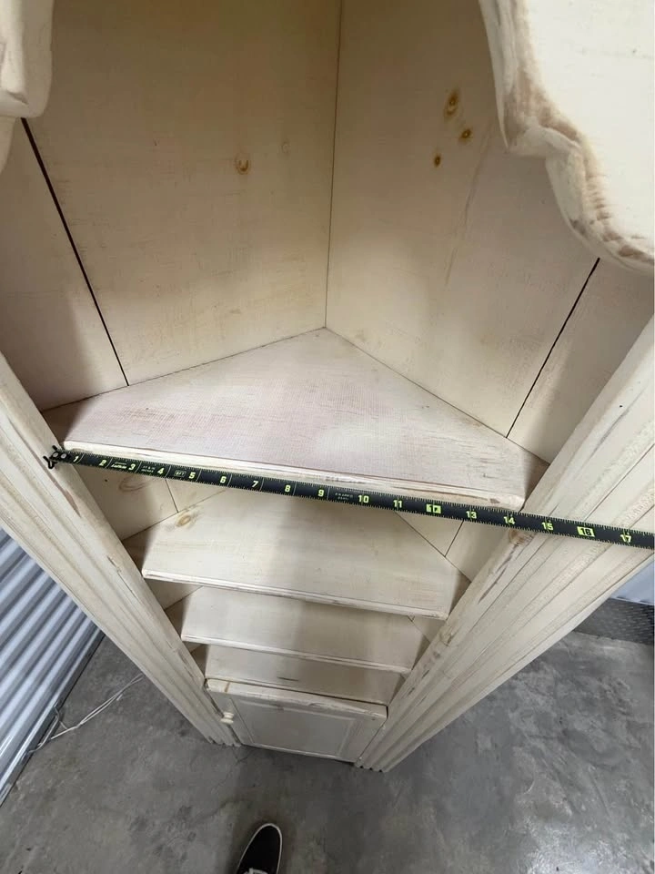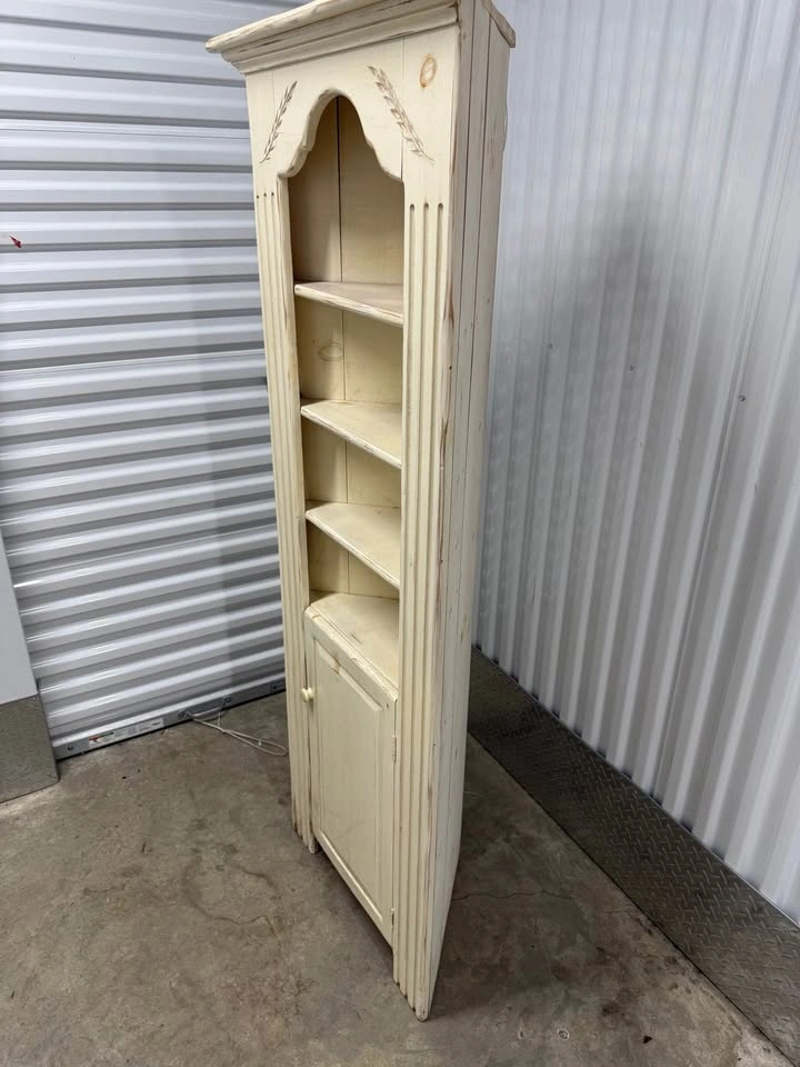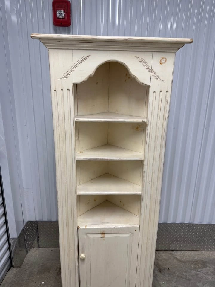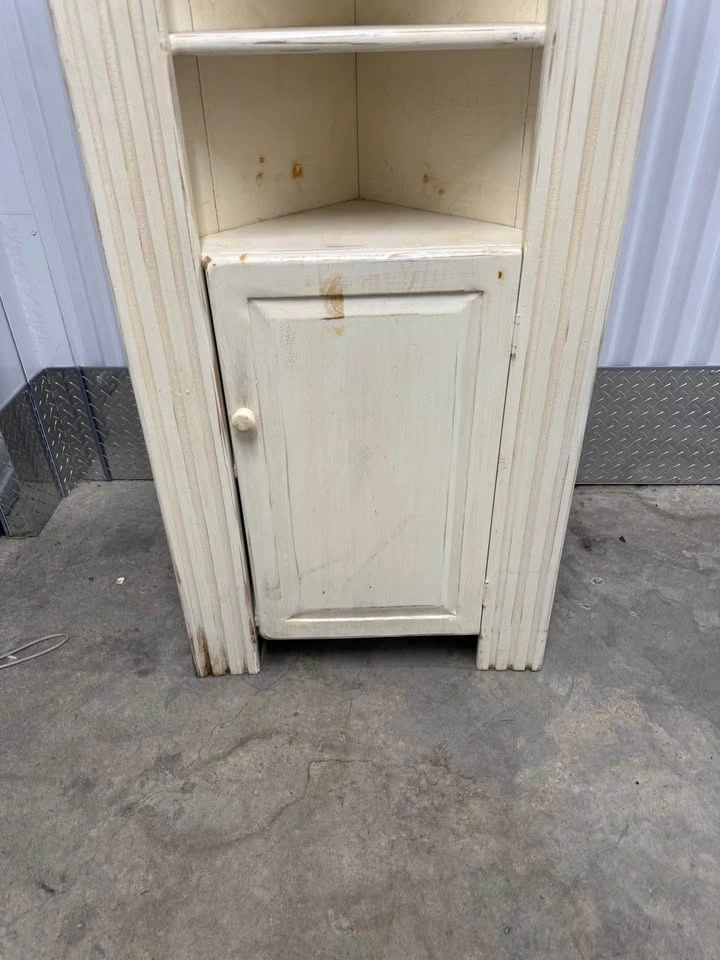 Nice corner shelf with cabinet. Everything is in good condition and structurally sound. 4 shelves with 2 inside cabinet. Measurements: 68” x 28” x 17”. Please view photos for more details.