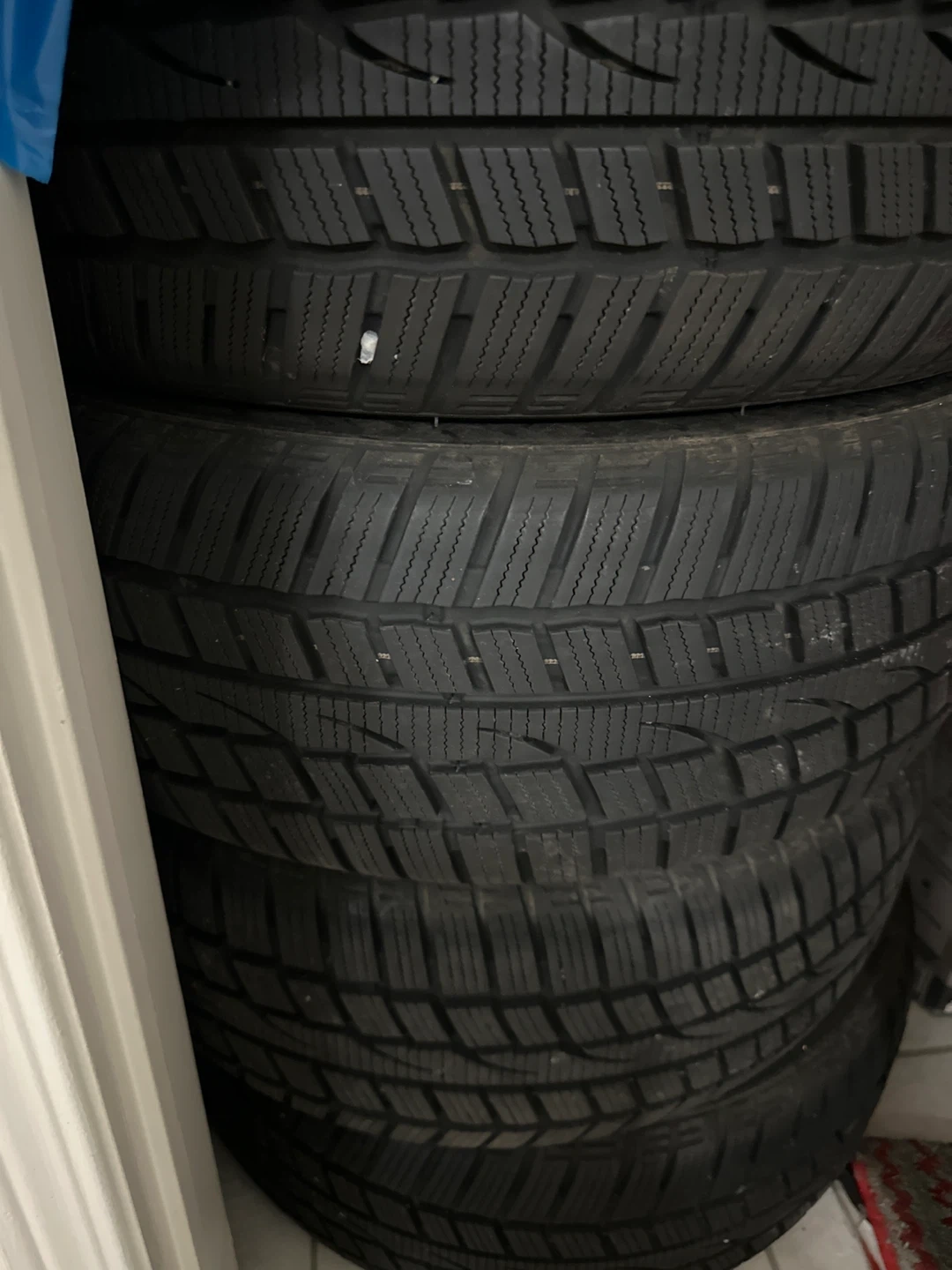 215/55R16. Four winter tires. These tires have a deep tread for excellent grip in snow and ice. They're black rubber with a directional tread pattern.only 500km used.