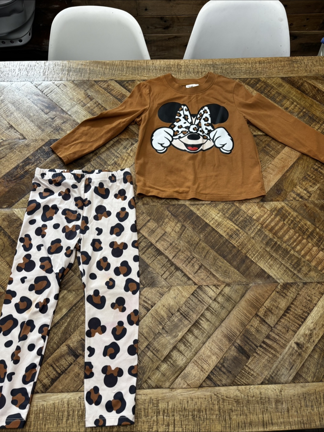 Super cute 3T Disney Minnie Mouse outfit. The set includes a long-sleeve top and matching leggings with a fun Minnie Mouse leopard print design. The leggings are made from a blend of polyester, cotton, and spandex for a comfy fit.